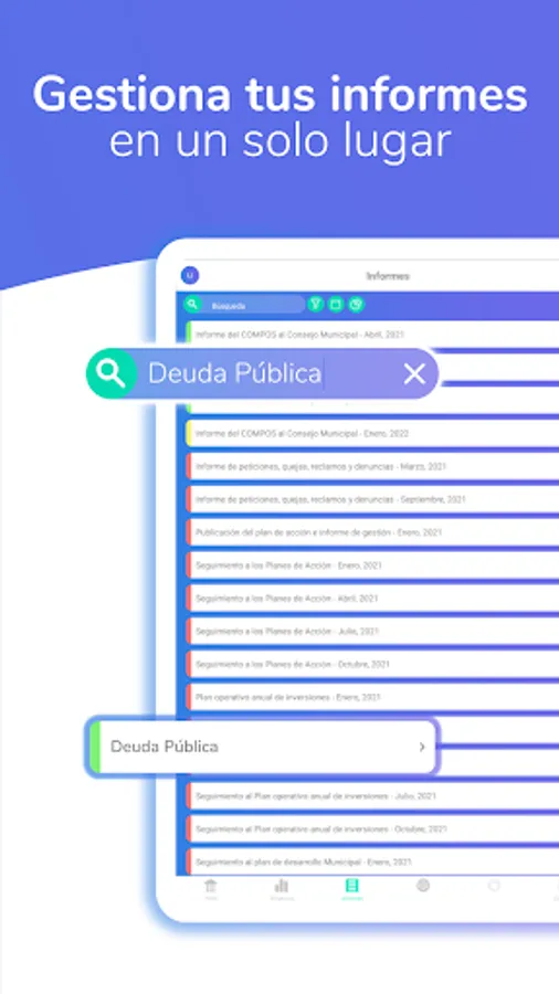 2. 1. Reports: In this functionality you will find the reports that the territorial entity is responsible for rendering to the different control entities, ministries, administrative departments, government and administrative units for their monitoring.