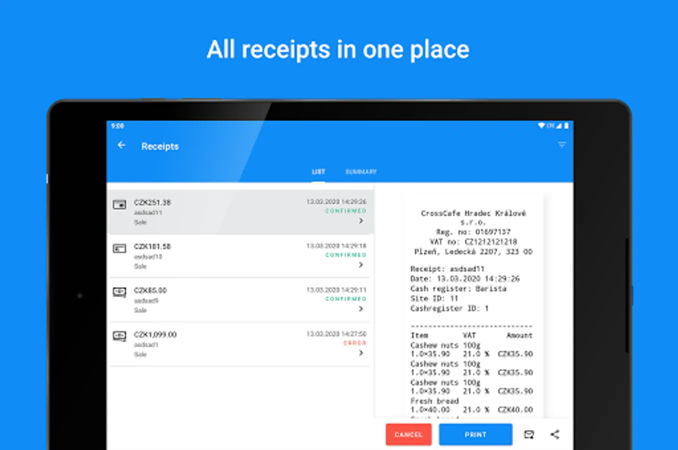 Spend more time focusing on your business and less time entering receipts and tracking your business expenses. The miniPOS cash register is clear and simple to use allowing you to create a new receipt in just a few clicks. You can check sales at any time and report on your sales over a selected period or specific shift.