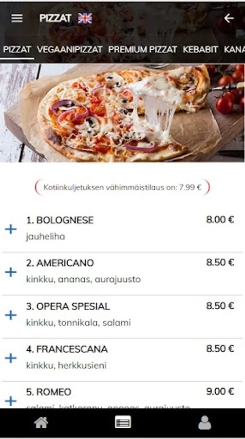 pizzat suoraan listasta, erilaiset valkosipulileivät tai extratäytteet ja annoksen kylkeen valittava juoma – tai