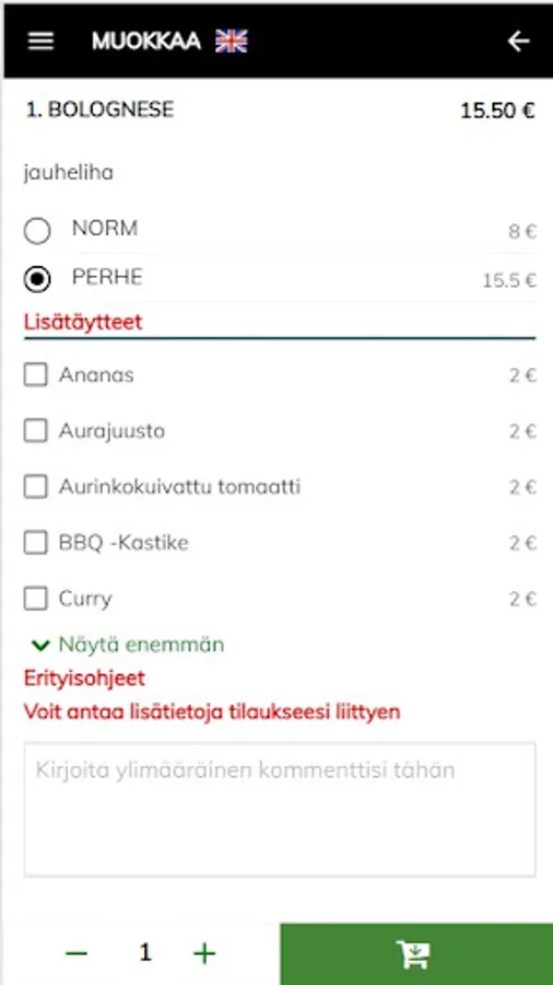 Valittuasi halutun ruoka-annoksen, lisäät sen ostoskoriin – tai valitset esim. lisätäytteitä. Voit tehdä vielä