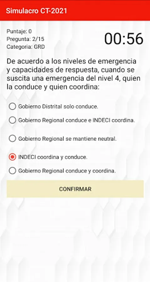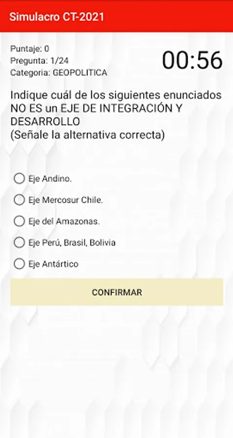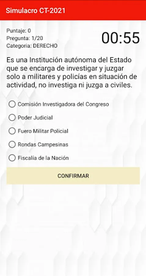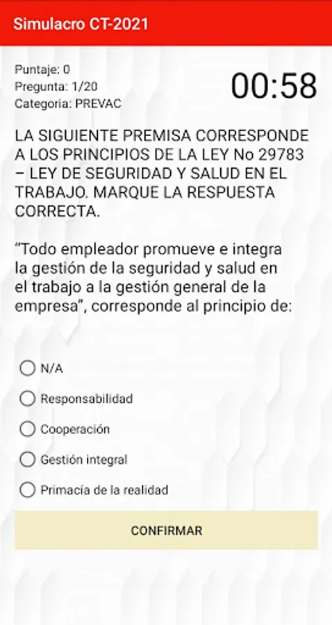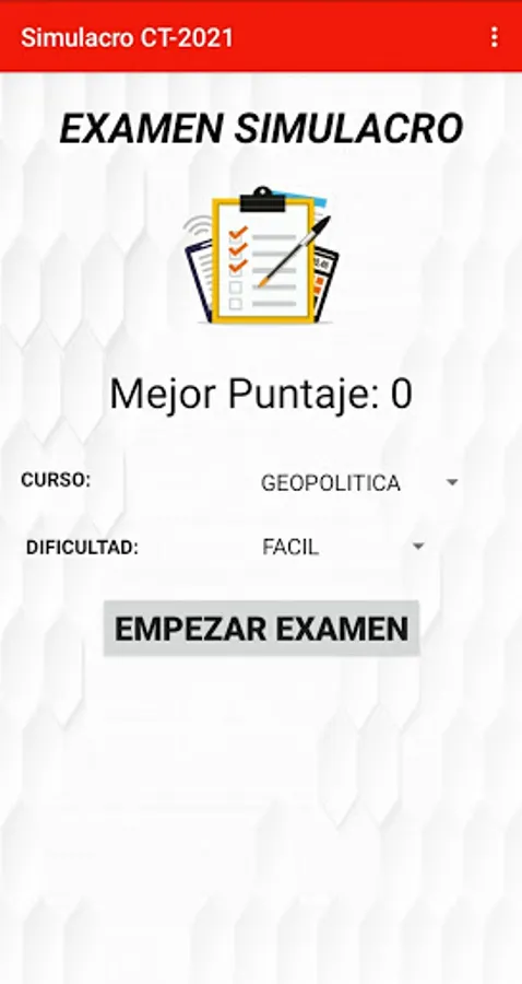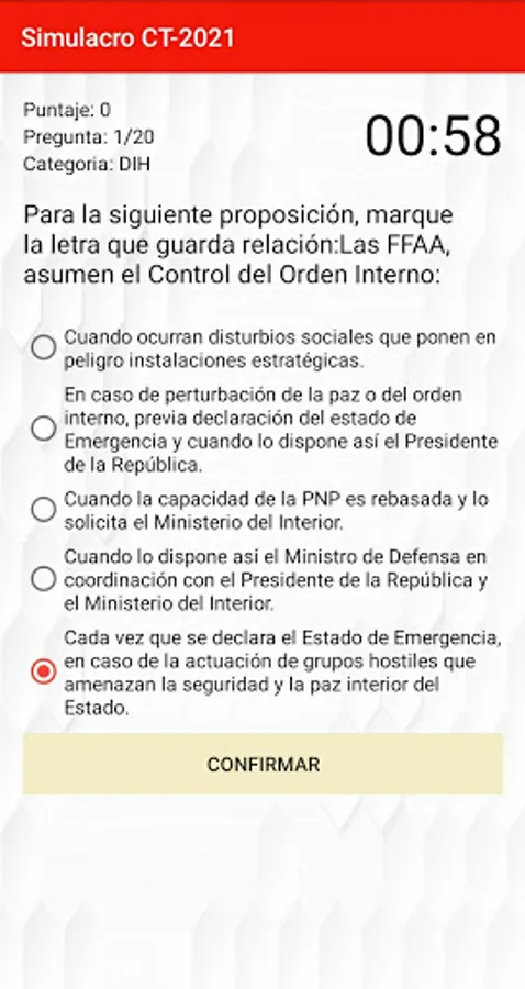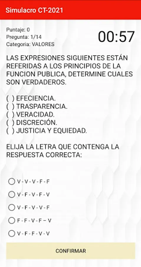 The SIMULACRO CT-2021 Application contains questions and answers from the updated bank, each of the courses consists of 20 questions to mark in a maximum time of 60 seconds for the easy level, 30 seconds for the intermediate level and 20 seconds for the difficult level