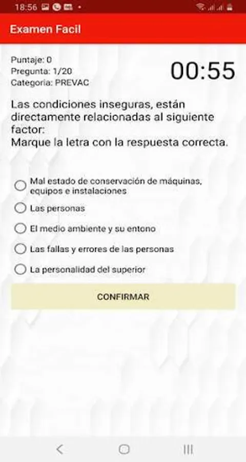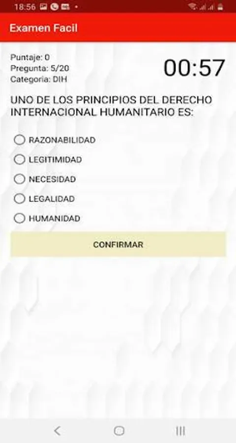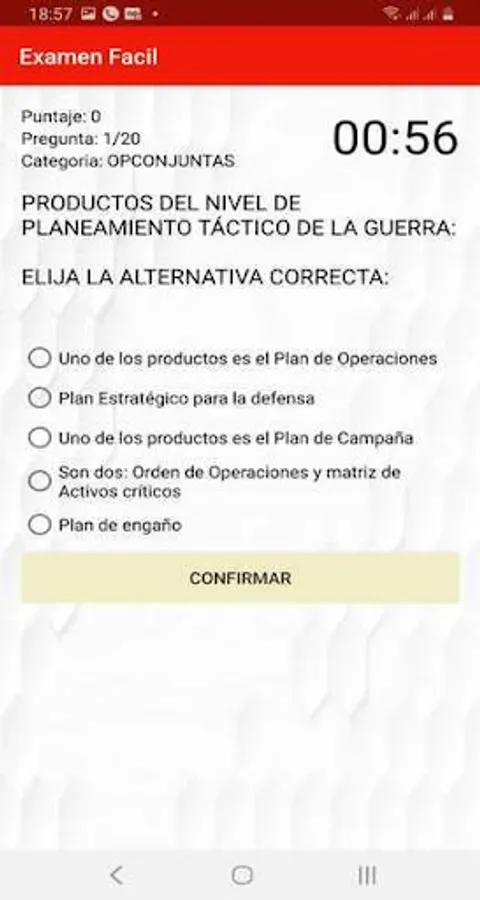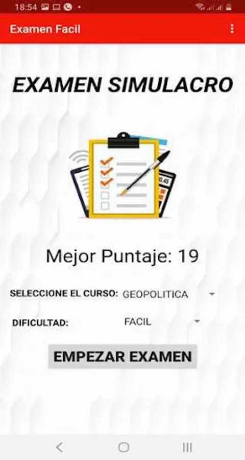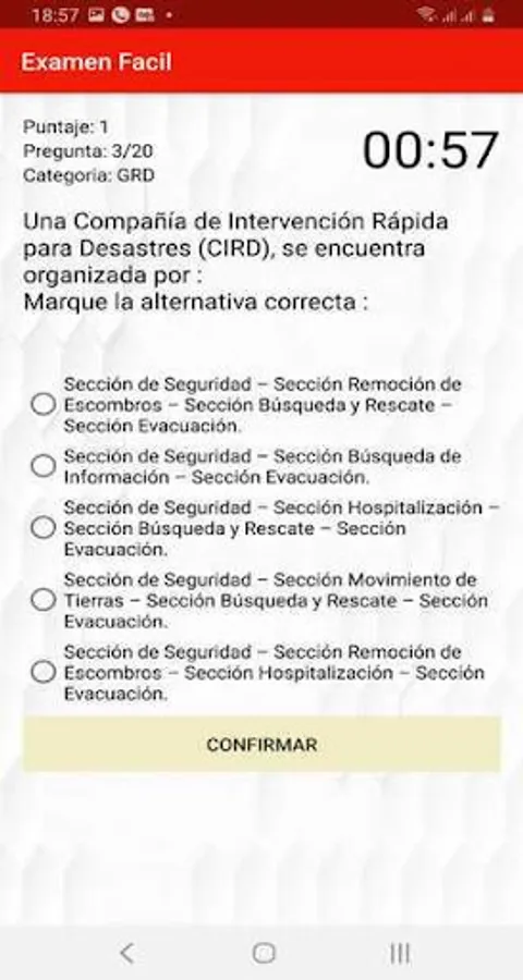 The SIMULACRO CT-2020 EXAM Application contains the entire bank of questions and answers of the updated bank, each of the courses consists of 20 questions to mark in a maximum time of 60 seconds for the easy level, 30 seconds for the intermediate level and 20 seconds to hard level