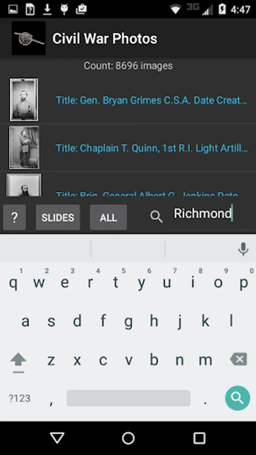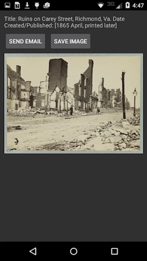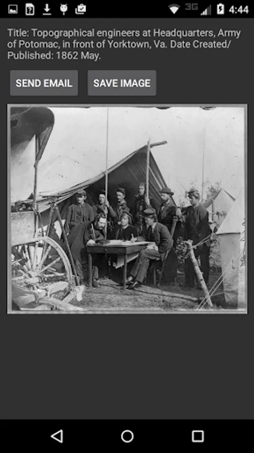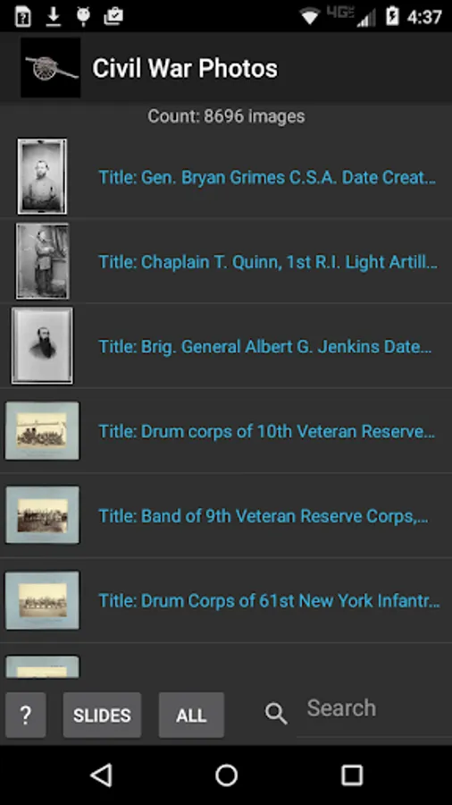 This app allows you to view and search a collection of photos of the American Civil War, 1861 - 1865, at the Library of Congress and in the public domain. The images are from the original glass plate negatives made under the supervision of Mathew Brady and Alexander Gardner plus additional sources according to the Library of Congress.