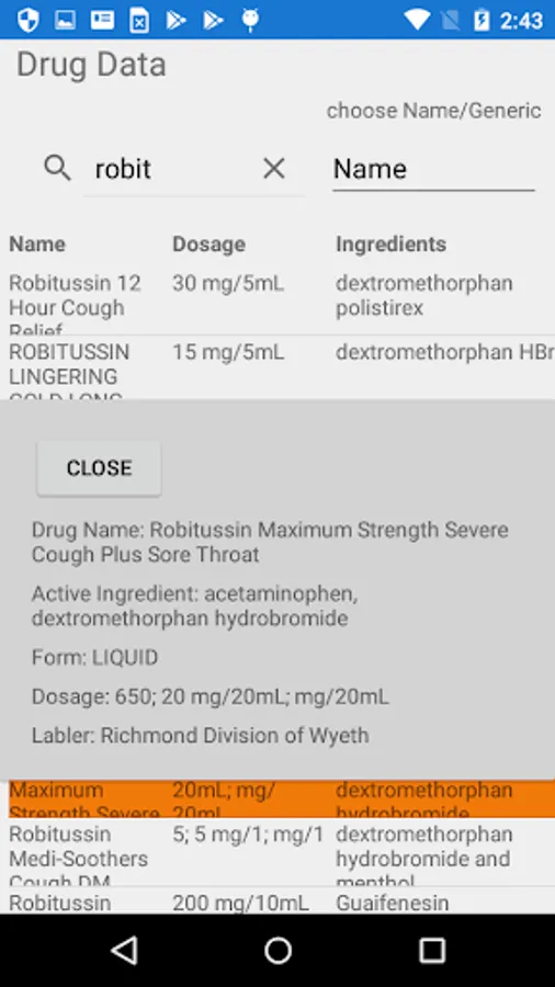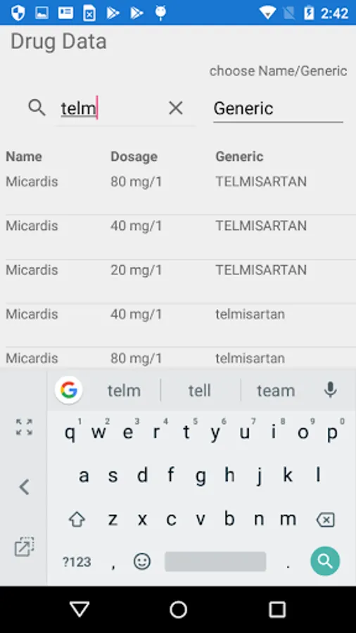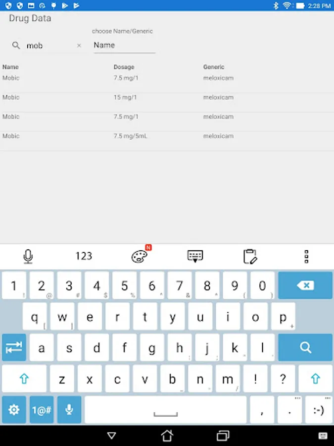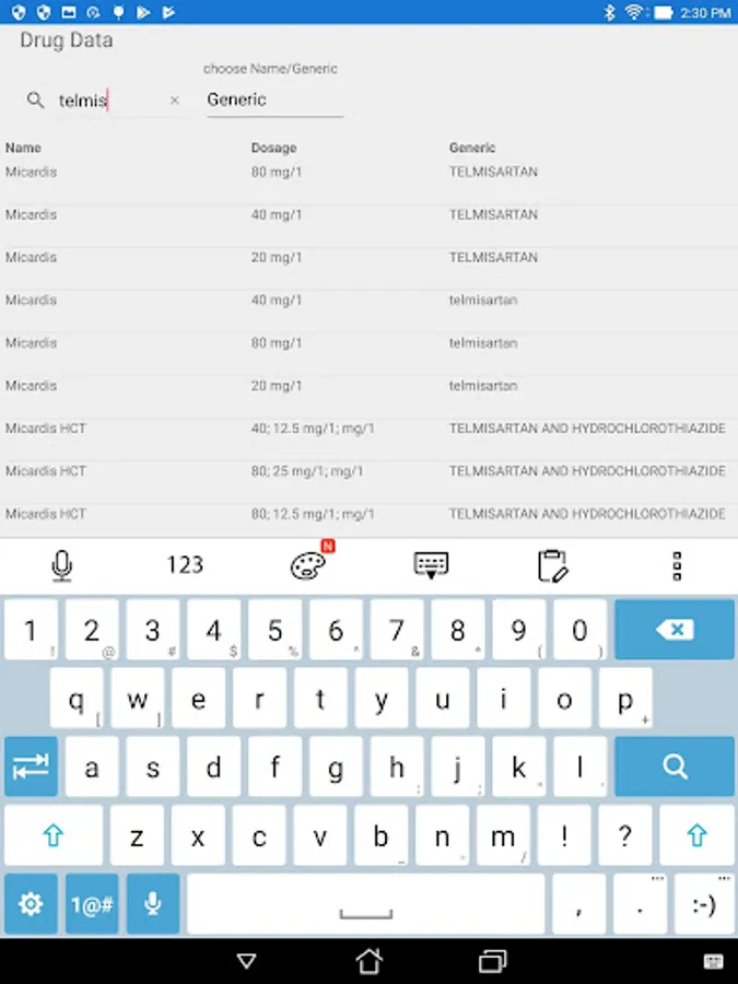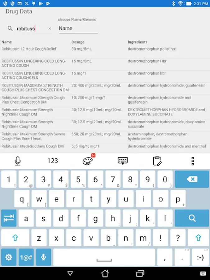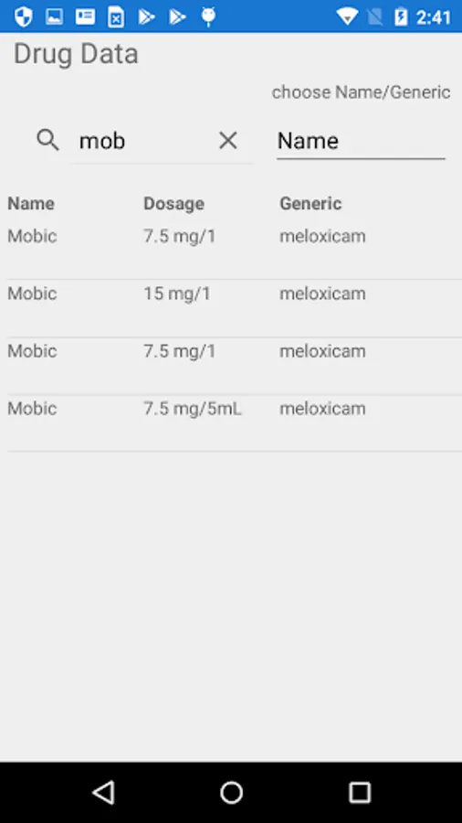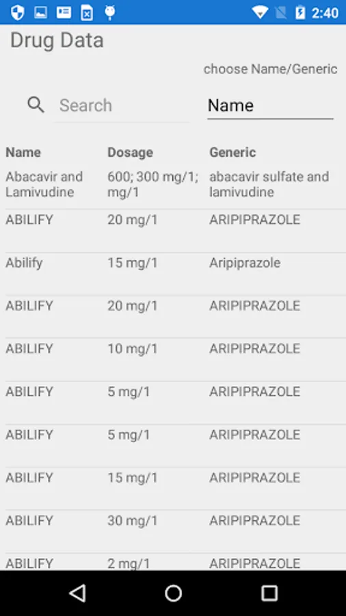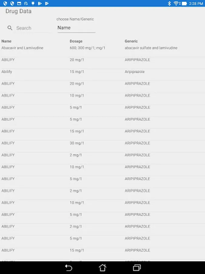 For prescription drug data, tap the Prescription Button. After the data is loaded, which may take a few moments, a grid will appear containing 8,894 drugs sorted by Name, listing also the dosage and the generic name of the drug. You may search the list by Name or Generic Name As you type in the letters of the name, the list is narrowed to those drugs with first letters being the letters you have entered. Type slowly. If you type rapidly, the response may take a while to catch up.