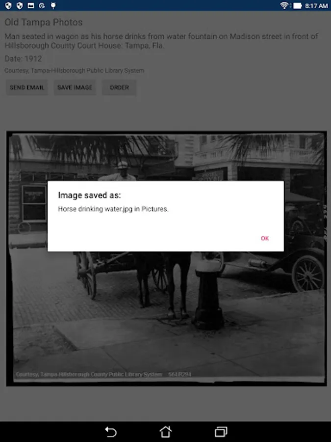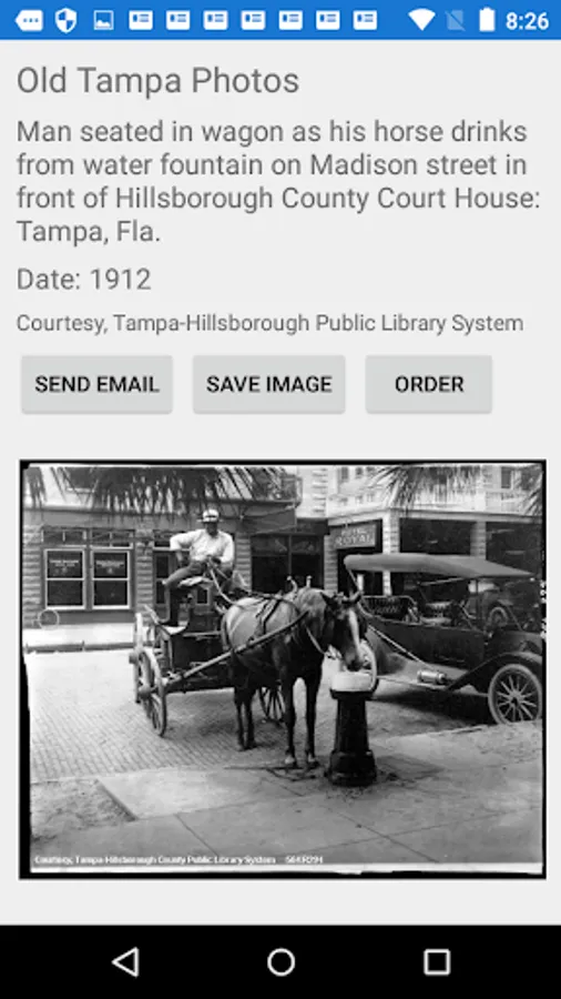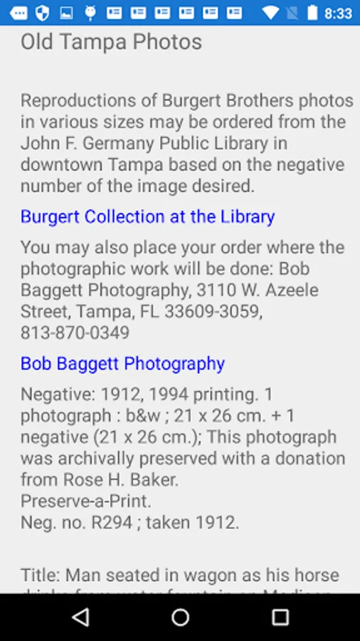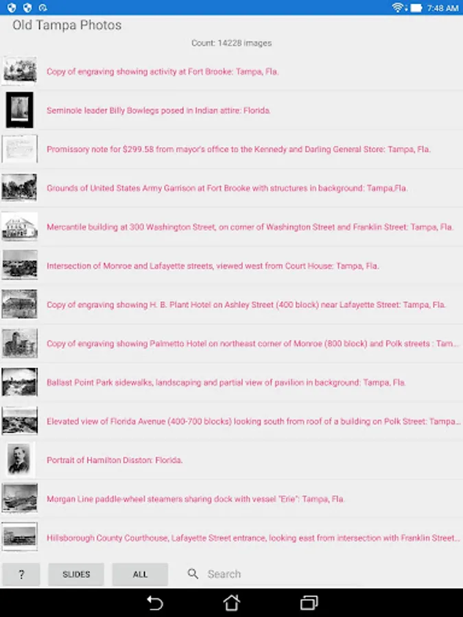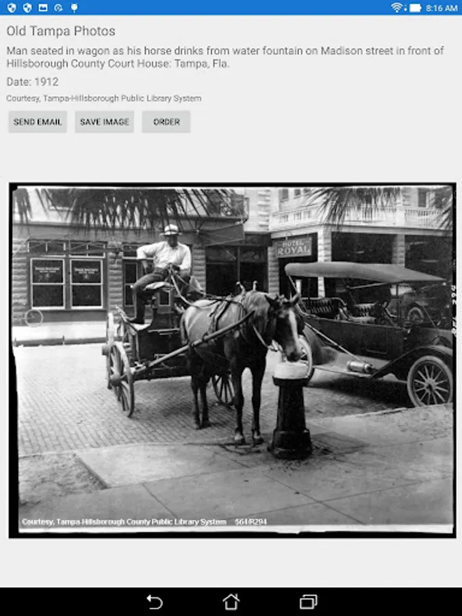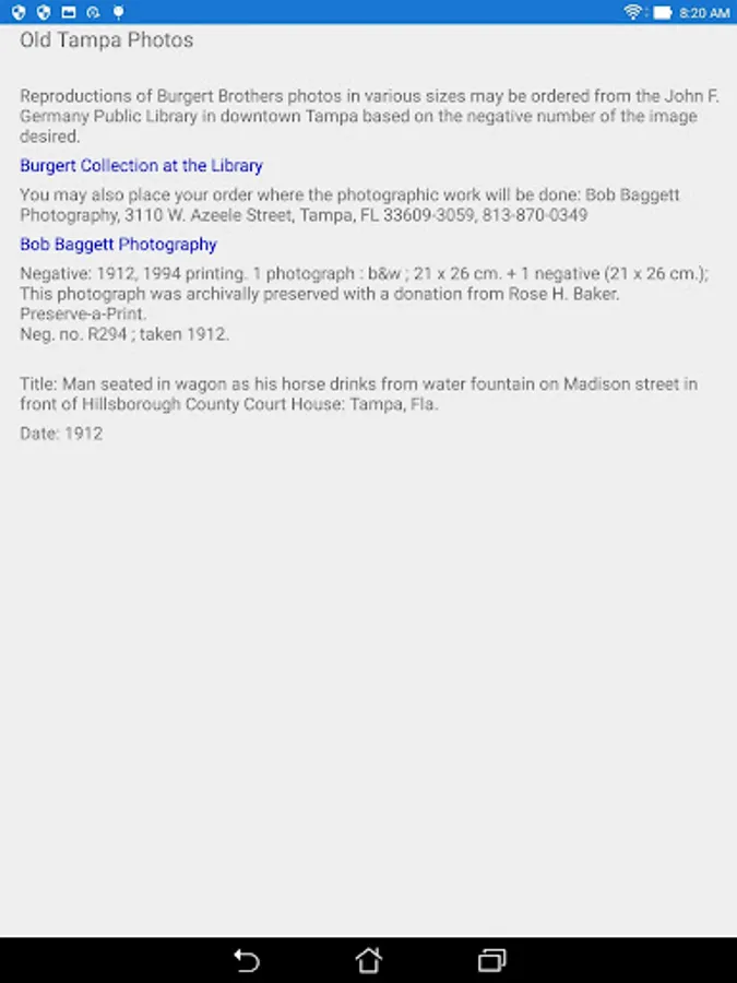 This app allows you to view and search the Tampa/Hillsborough County Public Library's collection of photos of the Tampa, Florida area photographed by the Burgert Brothers Photography Company from the 1890s until 1970. The collection has 14,228 images. A tap on a photo thumbnail will produce a larger image accompanied by a date and description of the photo. While viewing the photo, you may download a copy or share the photo and accompanying information via email.