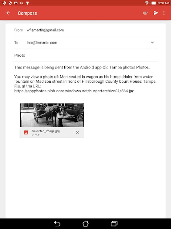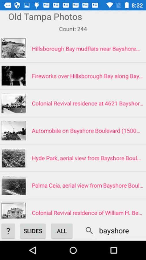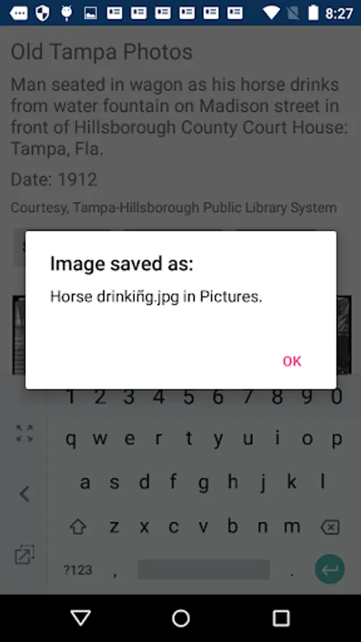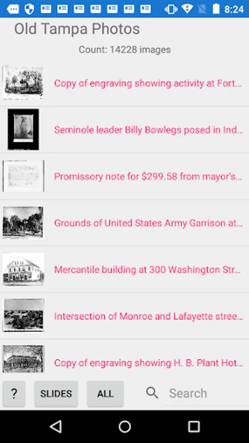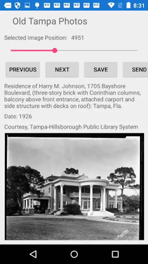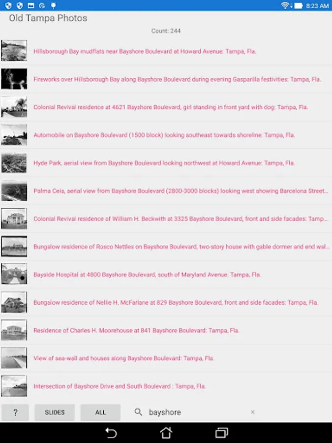 This app allows you to view and search the Tampa/Hillsborough County Public Library's collection of photos of the Tampa, Florida area photographed by the Burgert Brothers Photography Company from the 1890s until 1970. The collection has 14,228 images. A tap on a photo thumbnail will produce a larger image accompanied by a date and description of the photo. While viewing the photo, you may download a copy or share the photo and accompanying information via email.