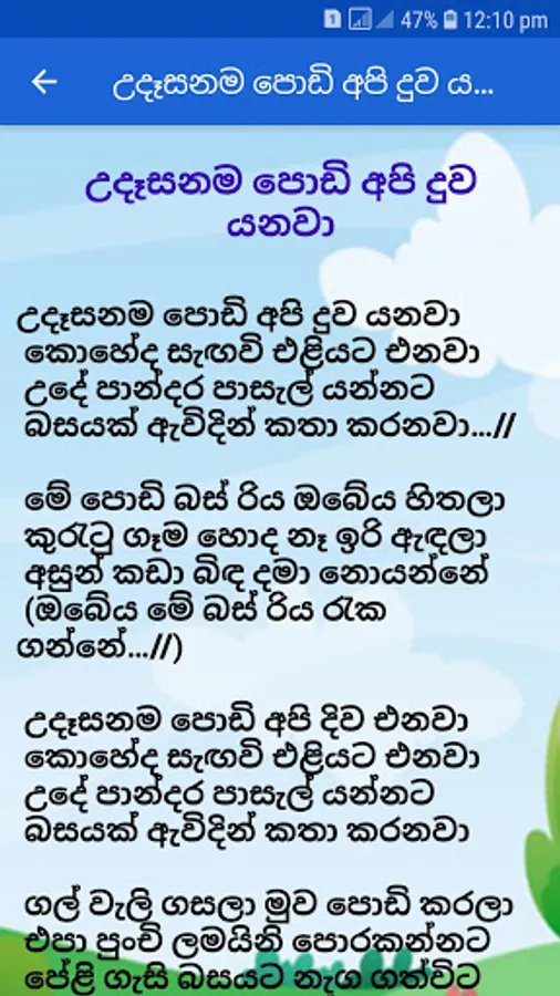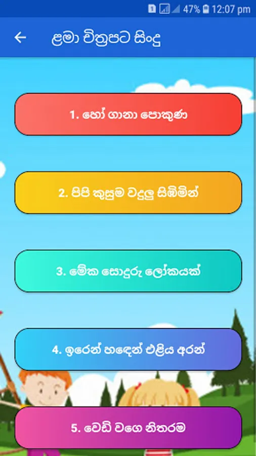 කුඩා ළමුන් සඳහා සුදුසු ළමා සිංදු එකතුවක් ඇප් එකක් ලෙසින් ලබාගන්න. පාසල් ගුරුවරුන්ටත්, දෙමාපියන්ටත්, කුඩාකල සිංදු ඇසීමට කැමති සියල්ලටමත් මෙය ප්රයෝජනවත් වේවි.