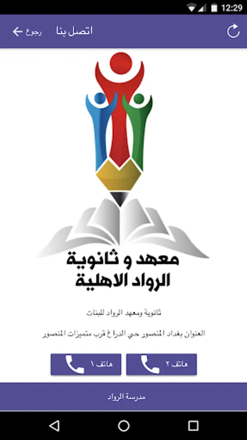 التطبيق الخاص لاولياء امور طلاب مدرسة الرواد الاهلية الكائنة في العراق بغداد المنصور حي الدراغ