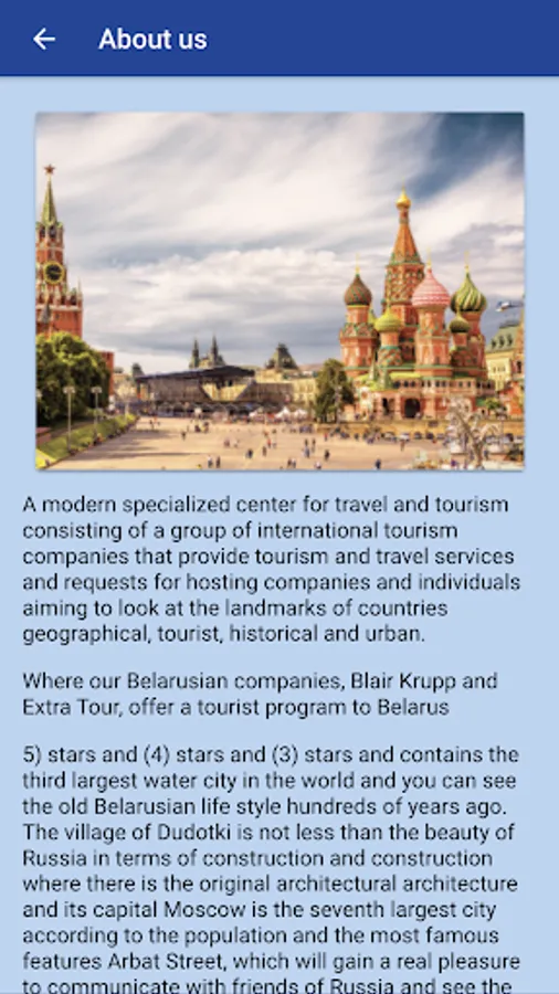 مدن ذات طبيعه خلابه واجواء جميلة وذات امان عالي حيث نسبة الجريمة صفر ولدينا فنادق راقية جدا (5) نجوم و (4) نجوم و (3) نجوم وتحتوي على ثالث اكبر مدينة مائية في العالم وتستطيع ان ترى اسلوب الحياة البيلاروسية القديمه قبل مئات السنين في قرية دودوتكي الفلكلورية ولا تقل نسبة جمال روسيا من حيث البناء والعمران حيث هناك الفن المعماري الاصيل وتعتبر عاصمتها موسكو سابع اكبر مدينة حسب عدد السكان ومن اشهر معالمها شارع اربات الذي ستكتسب متعه حقيقية في التواصل مع اصدقاء روسيا والاطلاع على الفن المعماري على جانبي هذا الشارع وتحتوي ايضا على مبنى الكرملين التاريخي ومتاحف موسكو الشهيرة التي تميز هذا الفن المعماري الاصيل وكذلك توجد طبيعة جميلة وهي تلال لينين حيث بامكانك مشاهدة مظهر علوي لمدينة موسكو بشكل رائع للغاية