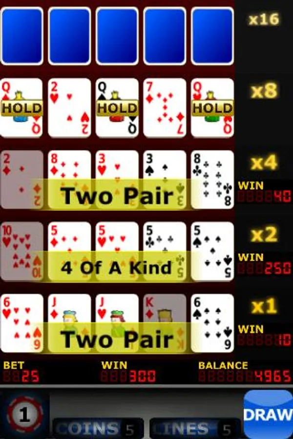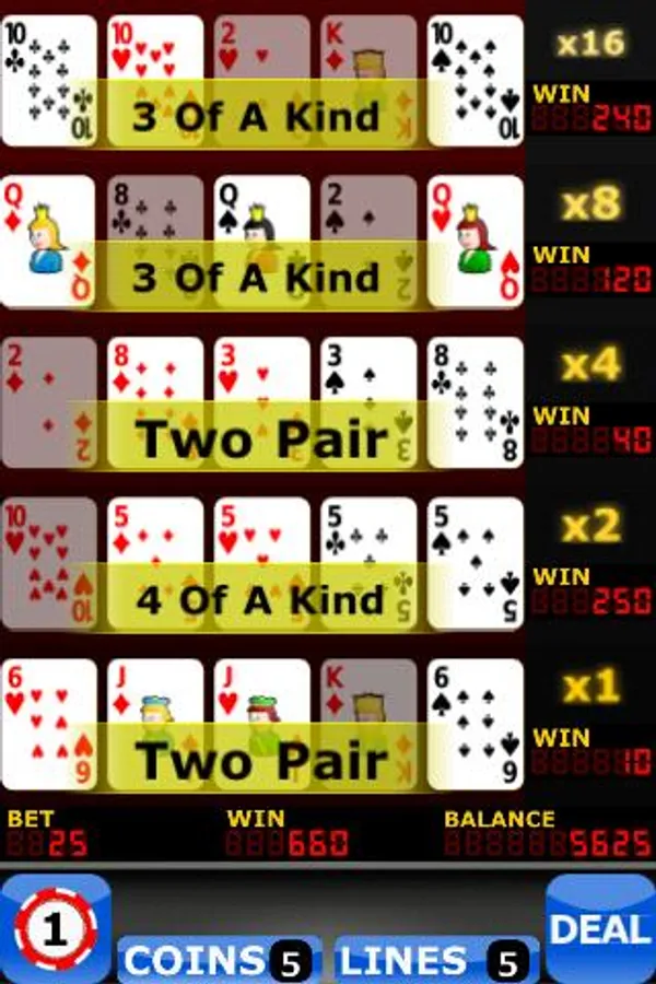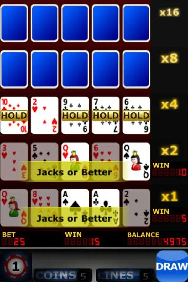 Select one of the video poker game modes, such as Jacks or Better, to begin playing. You can change the coin size by pressing the button with the casino chip, you can also select between playing 1-5 coins per hand.