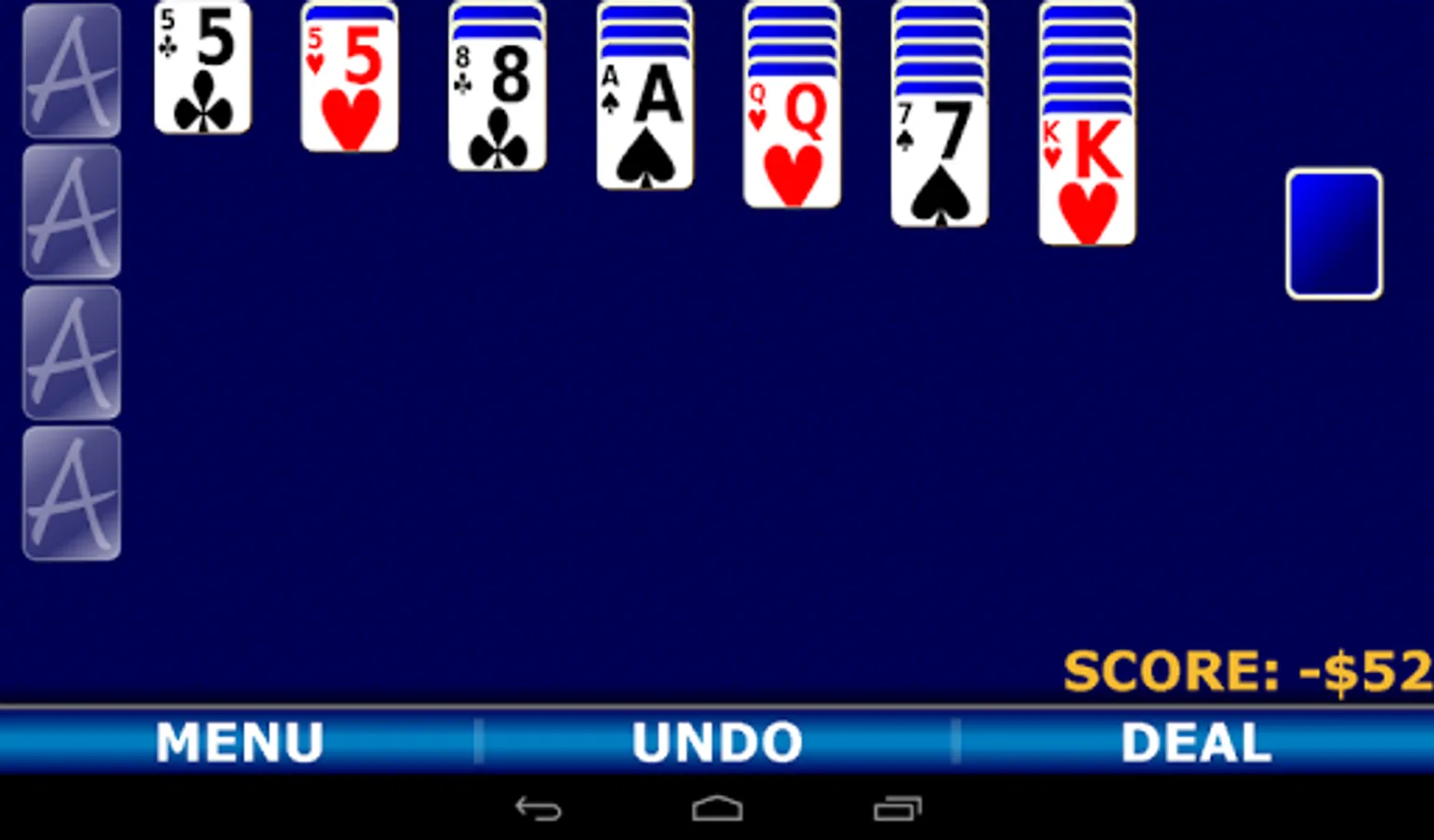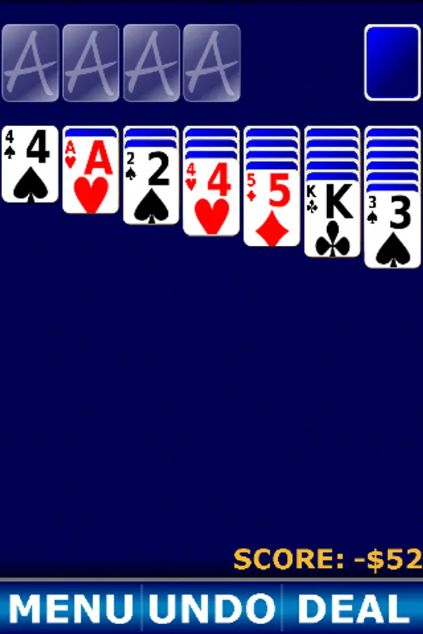 The classic game of Solitaire with the Vegas scoring style. Each deal costs $52 and you win $5 for each card moved to the foundation.