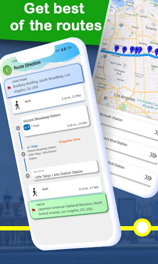 •Click on your preferred route and get all small details like minimum walking distance to the nearest transport to pick up point and after drop point to your destination to make it your LA / Los Angeles travel complete.