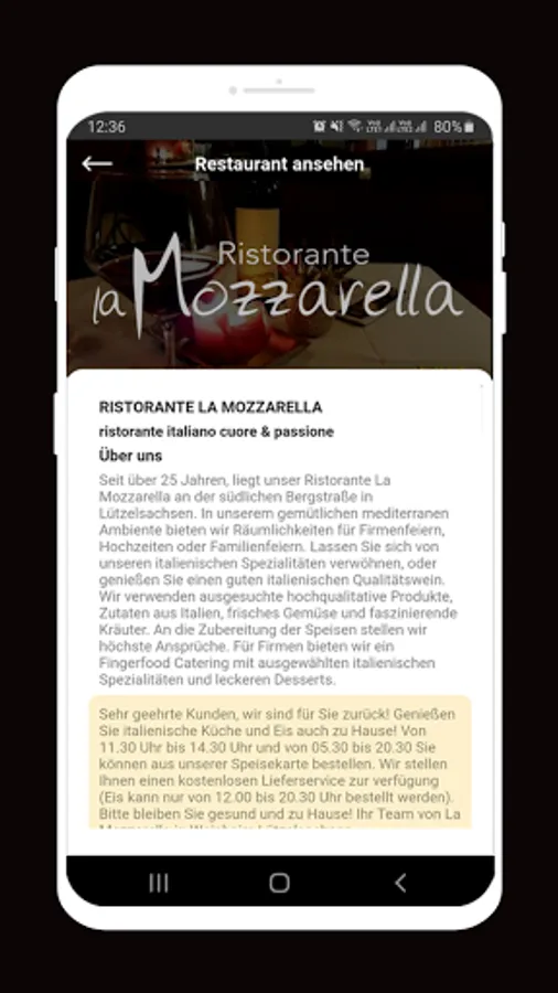 Our Ristorante La Mozzarella has been located on the southern Bergstrasse in Lützelsachsen for over 25 years. In our cozy Mediterranean ambience, we offer rooms for company celebrations, weddings or family celebrations. Let yourself be pampered by our Italian specialties, or enjoy a good Italian quality wine. We use selected high quality products, ingredients from Italy, fresh vegetables and fascinating herbs. We place the highest demands on the preparation of the dishes. For companies we offer finger food catering with selected Italian specialties and delicious desserts.