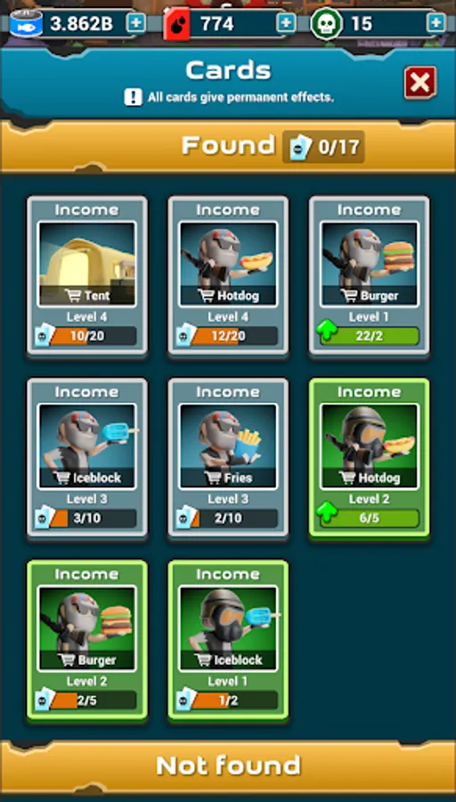 - Collect all kinds of cards upgrades to boost supplies income and get stronger heroes