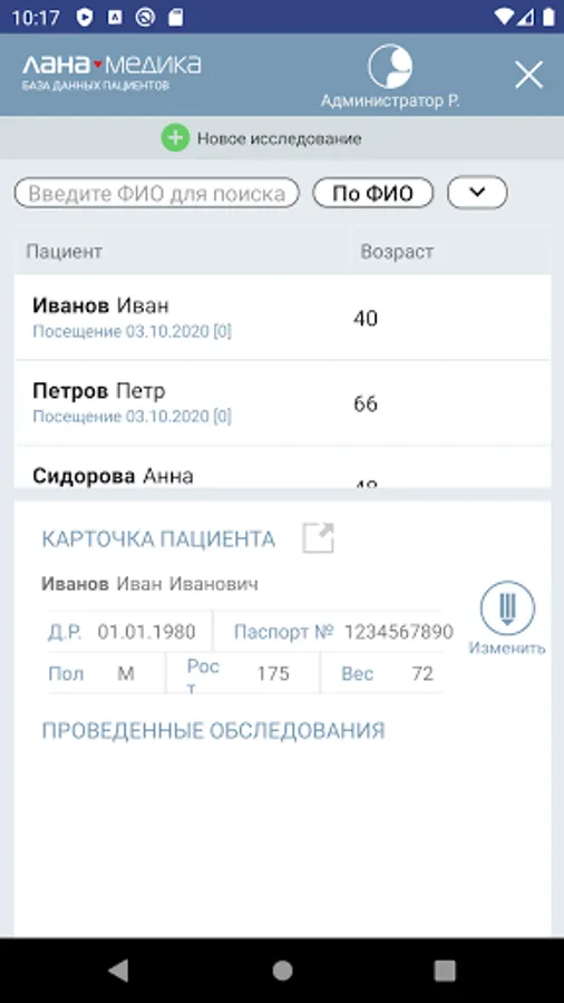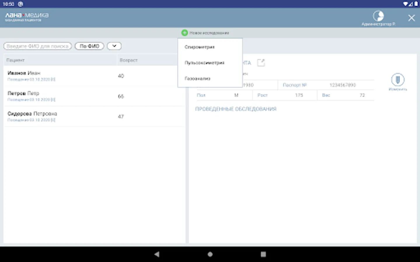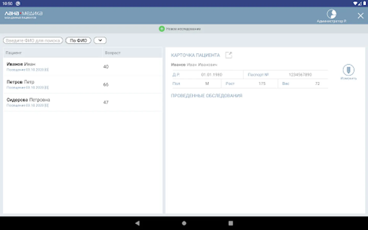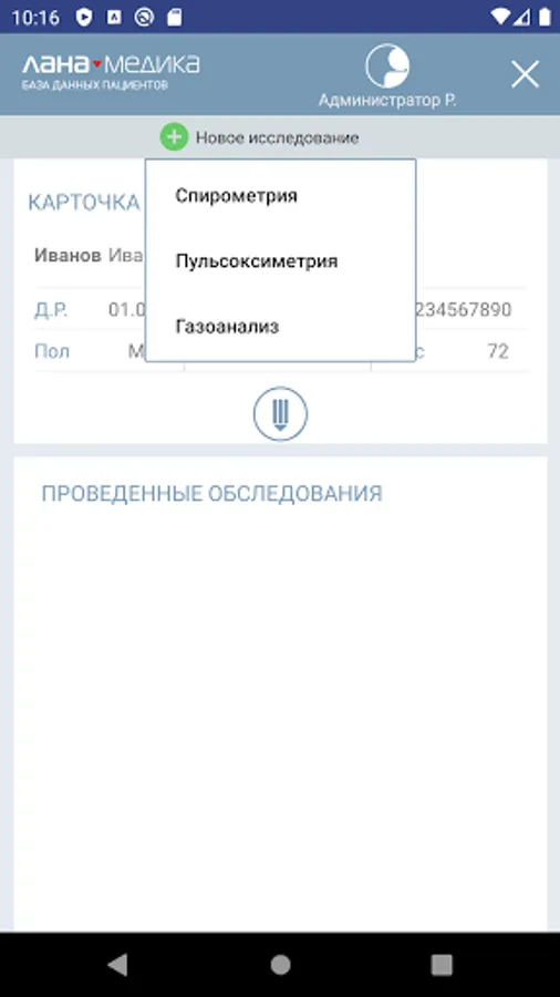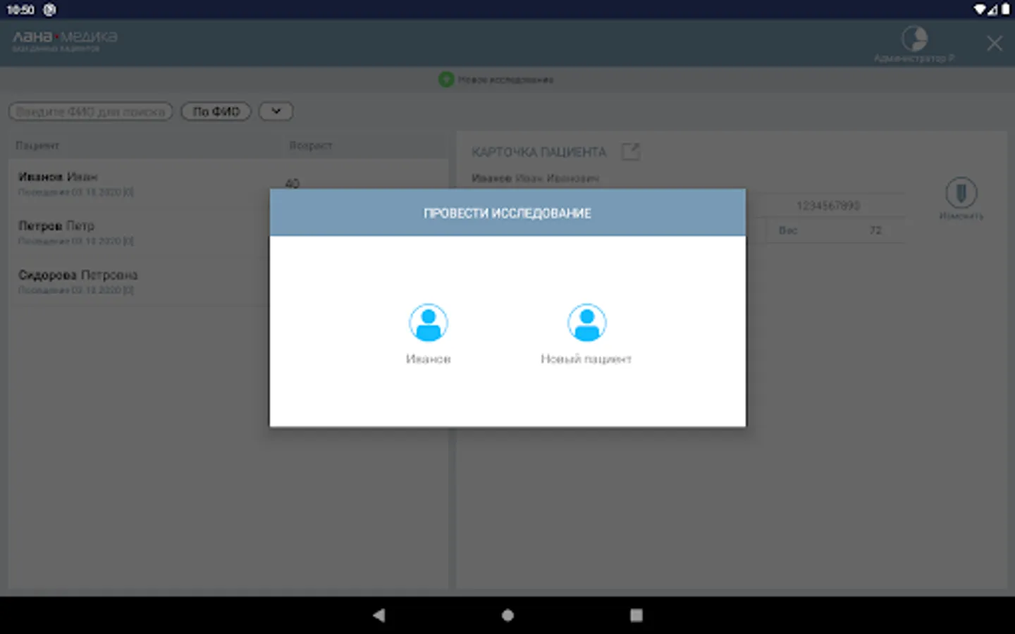 The Mobile Registry allows conducting research both in a medical facility and on the basis of a remote feldsher-obstetric center (FAP), storing information about patients and examinations. After the examination, the results are stored in the device's memory and can be transferred to the cloud server online or later (for example, if the Internet is not available).