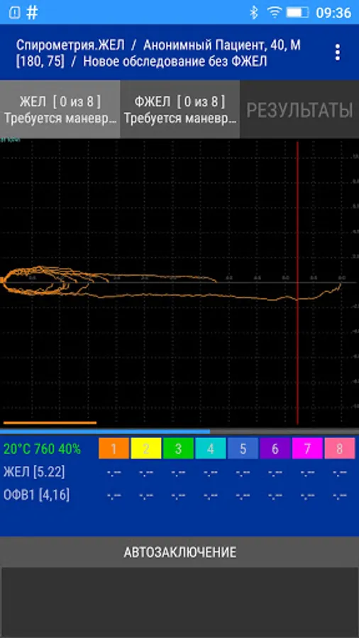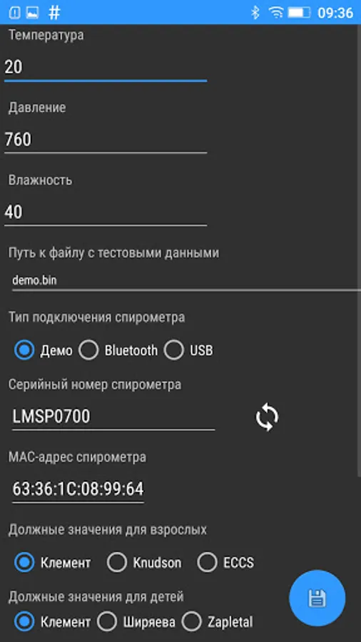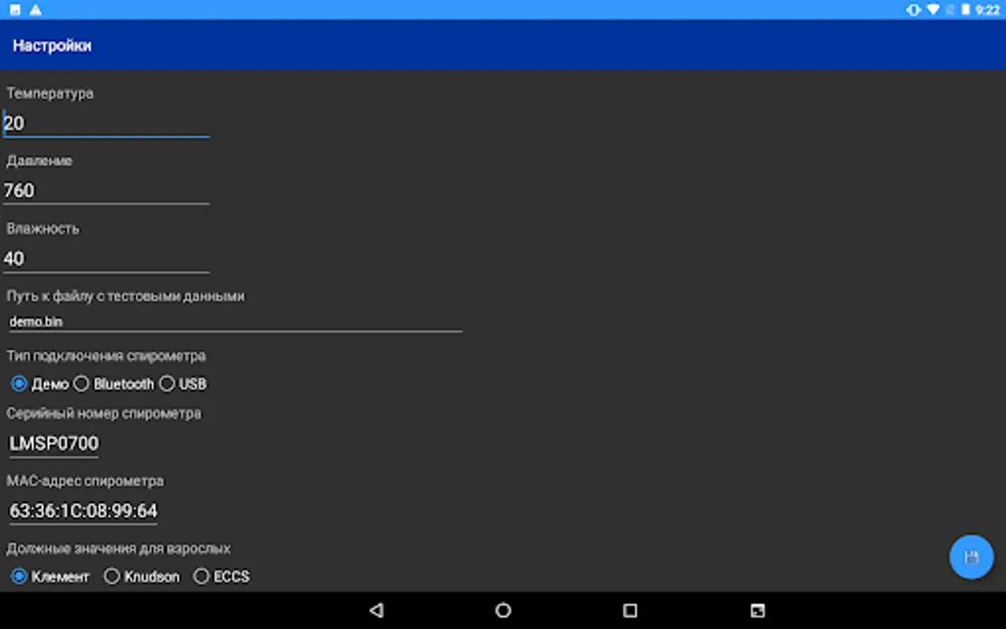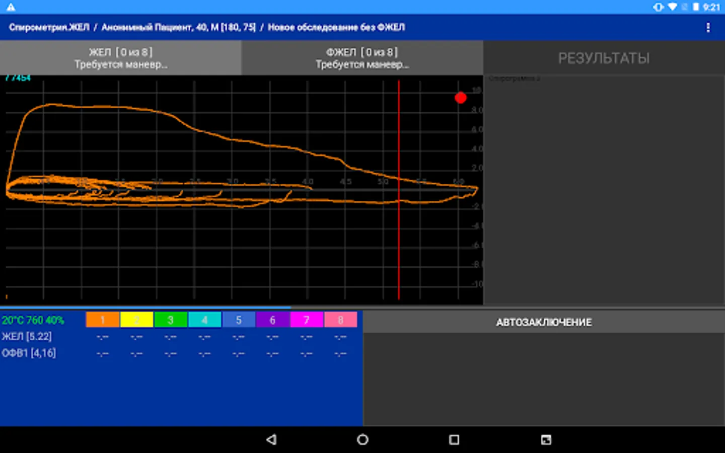 Application for Spirolan Mobile - a portable spirometer with wired or wireless connection to a mobile device (tablet or smartphone) and autonomous operation.