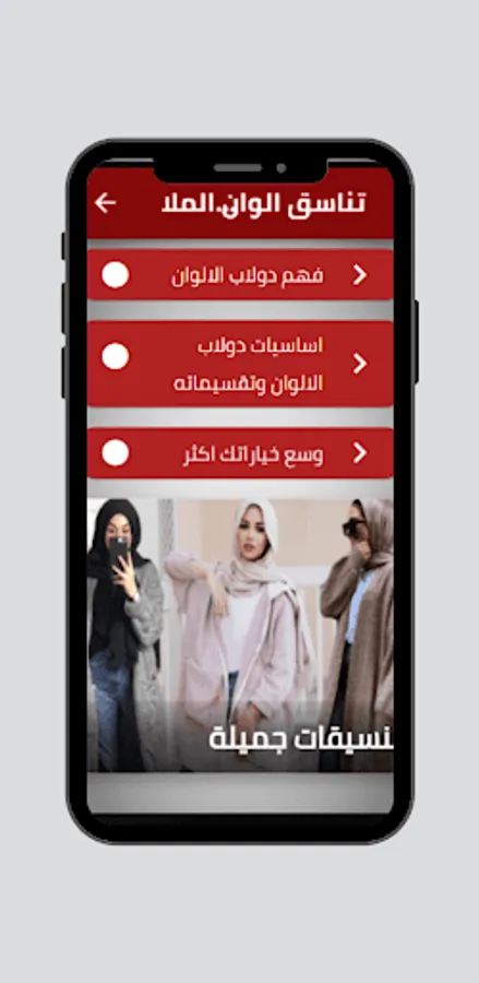 Coordinating the colors of clothes with gray, beige, and with navy and brown pictures for men and women. The application also contains pictures of wonderful models with beautiful formats. The wheel and color wheel can be used in coordinating home furniture as well.