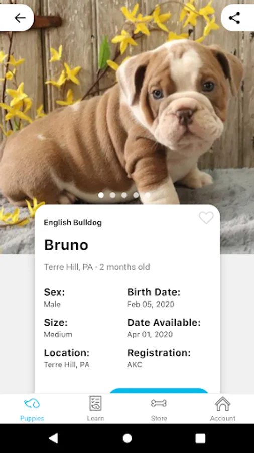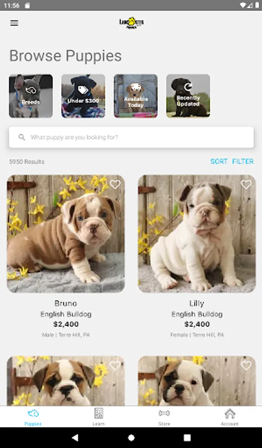 - Filter puppies by location, breed, price, size, and sex