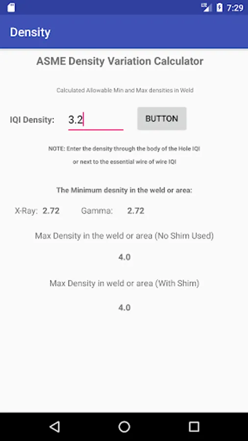A radiography density variation calculator for ASME Section V users. The code allows the density in the area of interest to be no more than minus 15% or plus 30% of the density that you measure through the hole type IQI or next to the essential wire on wire type IQIs.