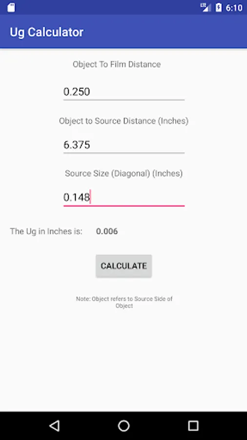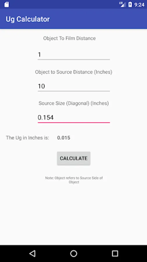 This app calculates the Geometric Unsharpness (Ug) for industrial radiography. Geometric Unsharpness is also referred to as "Penumbral Shadow".