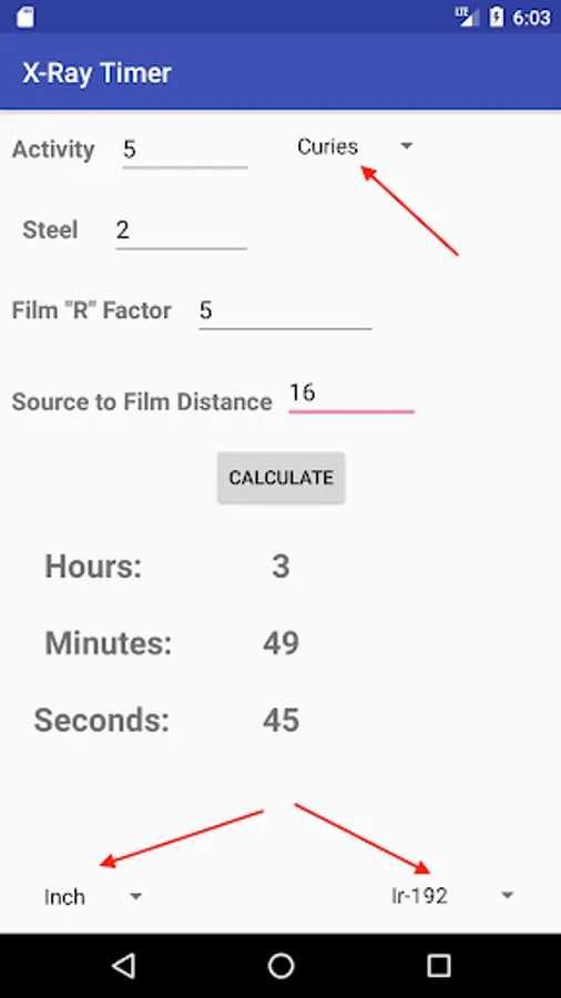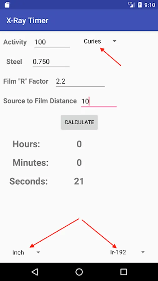 The app has the ability to change between inches and MM, Curies or TBq. It also obviously has a selector for which isotope you are using.