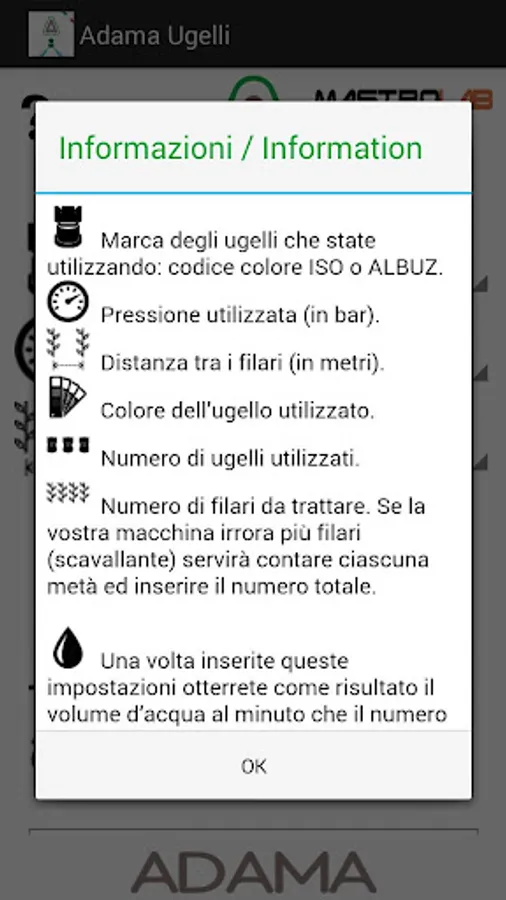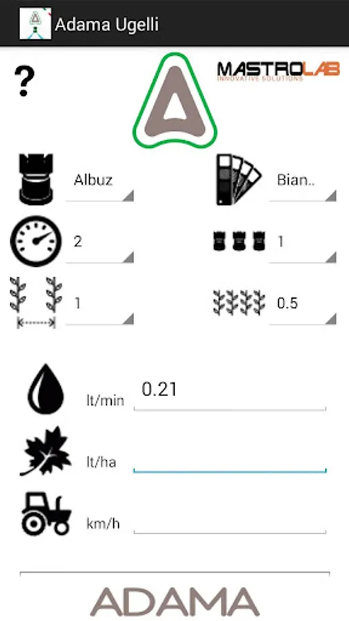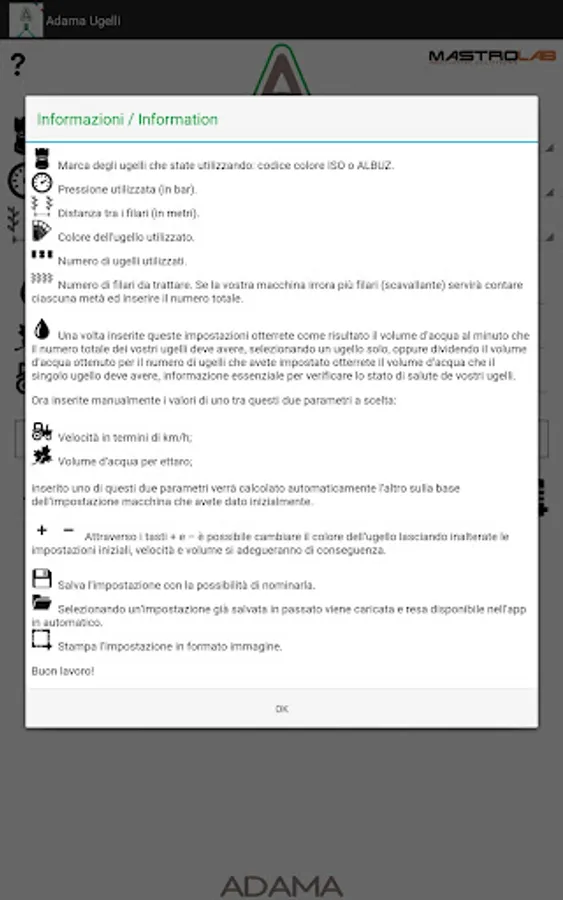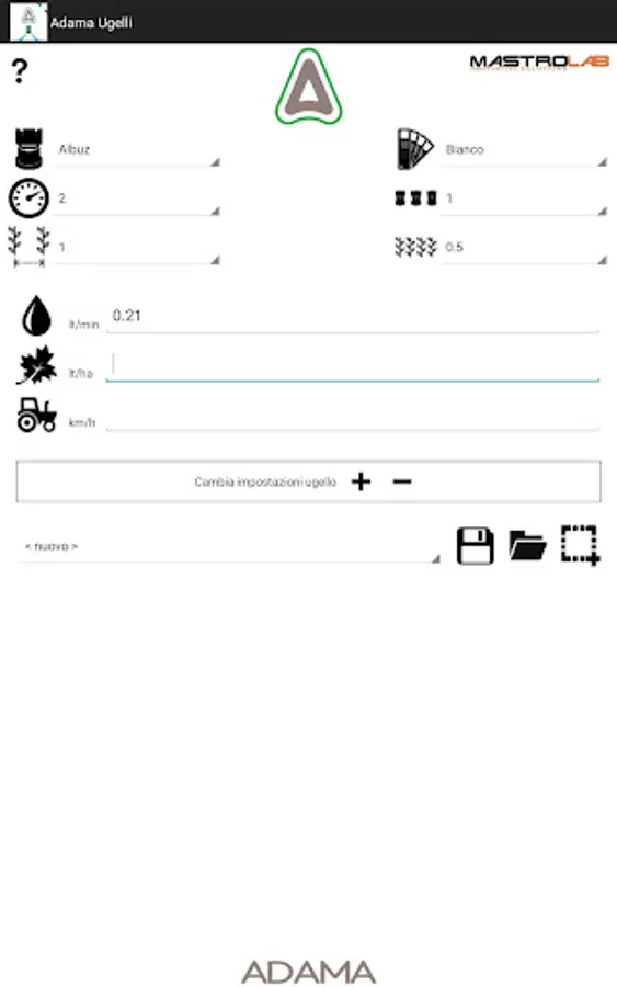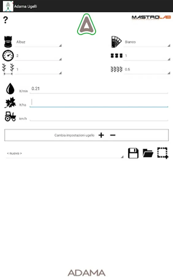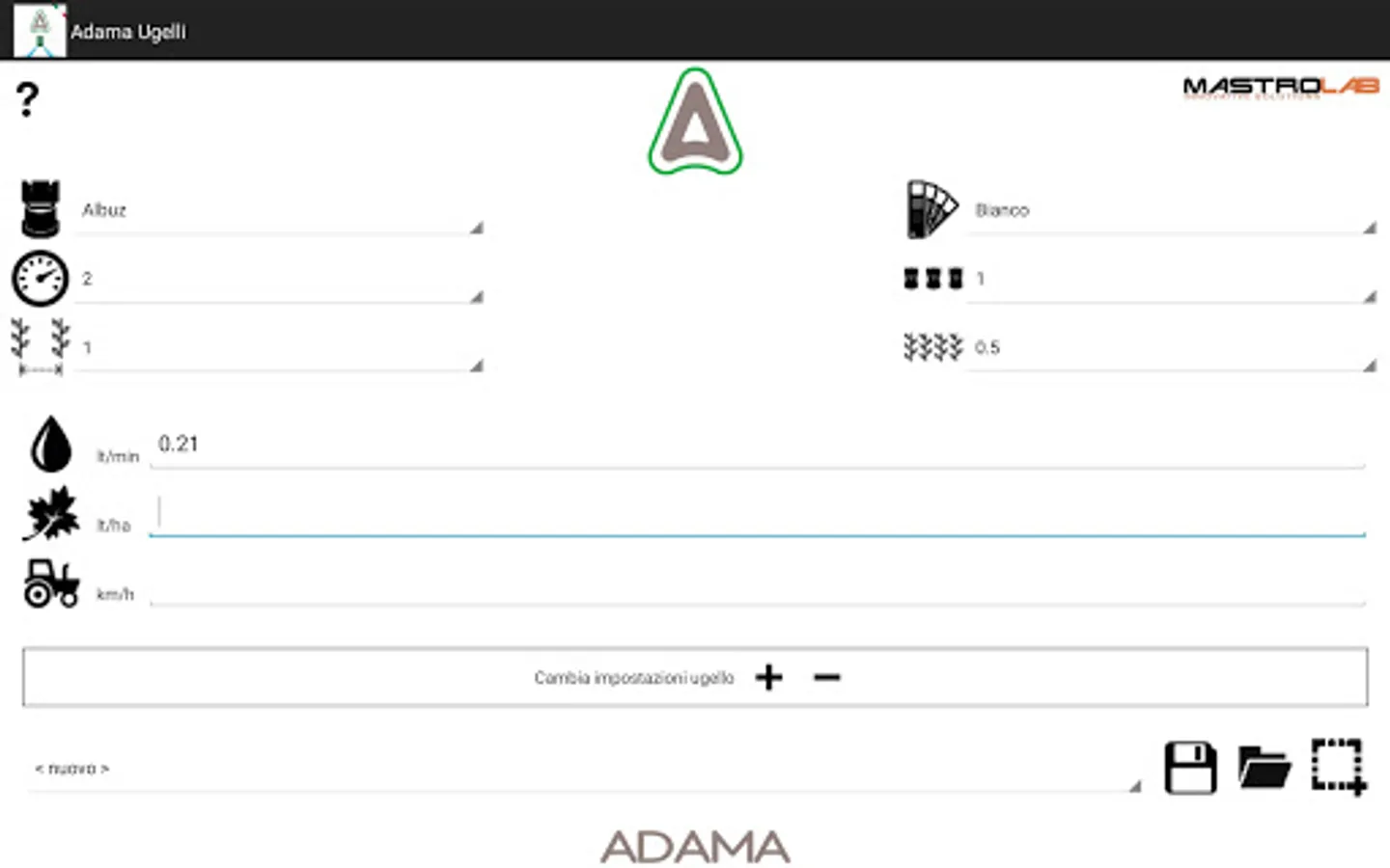 Setting type and characteristics of nozzles used will be possible to automatically obtain the gallons of water per minute for single nozzle, vital to check the state of health of its nozzles. By setting the speed in km / h on your machine you get the water volume (liters / hectare) must, conversely setting the volume of water you want to use you get the speed at which the machine must be followed. You can save different settings, store them and name them to view them when needed.