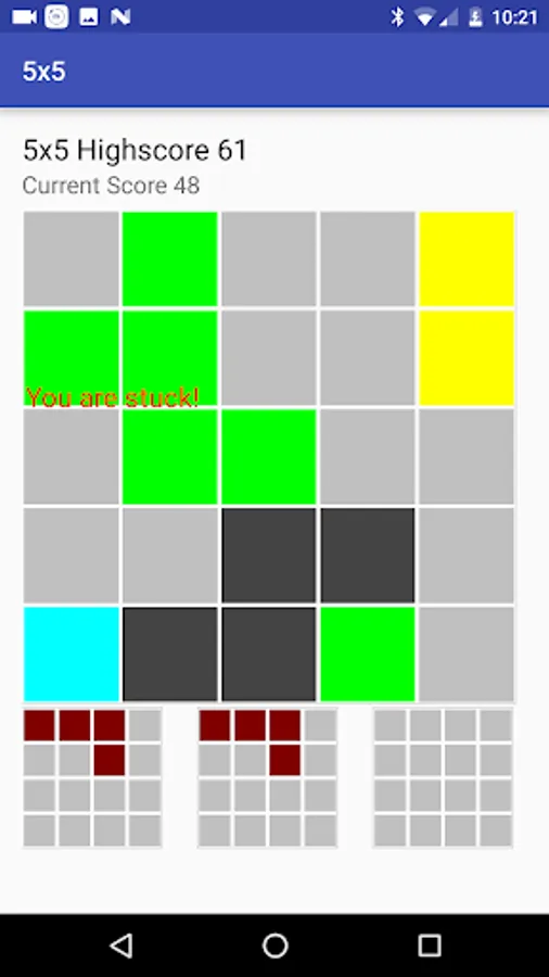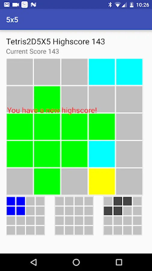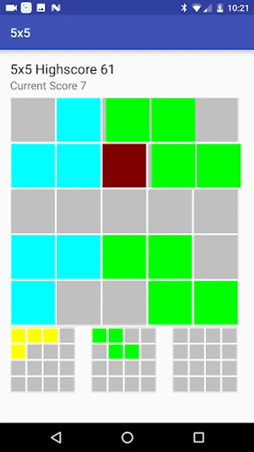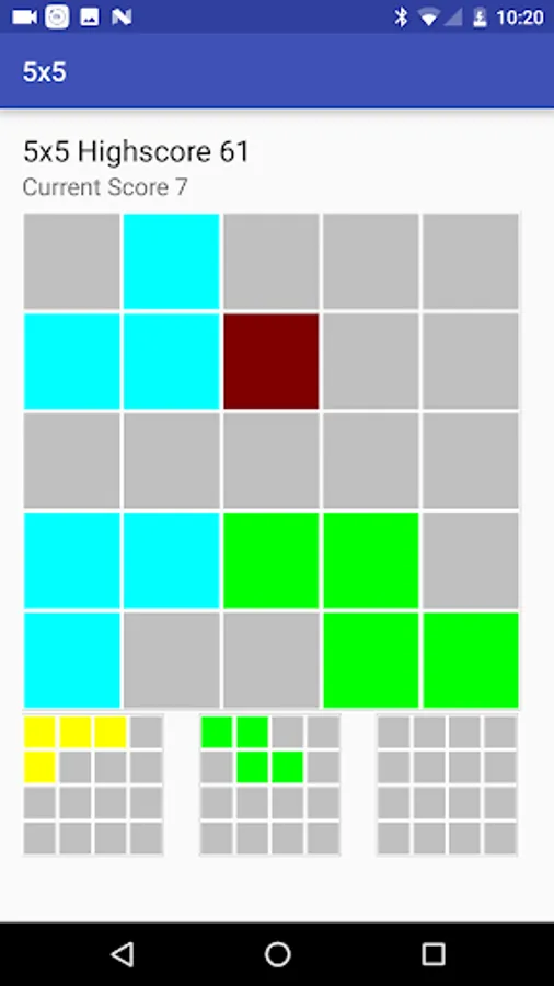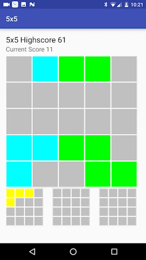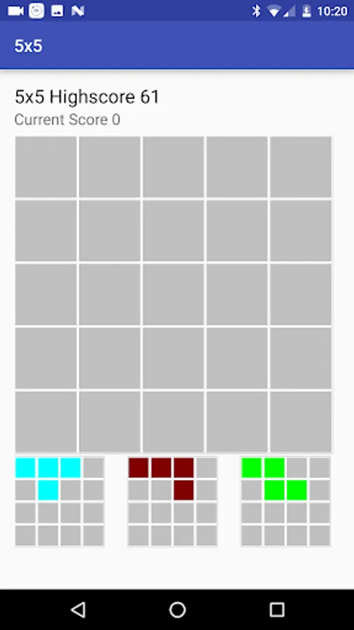 Drag to move the bottom pieces on the 5x5 grid. Click the piece to rotate. Finishing a full row or column will earn you points and clear that row or column.