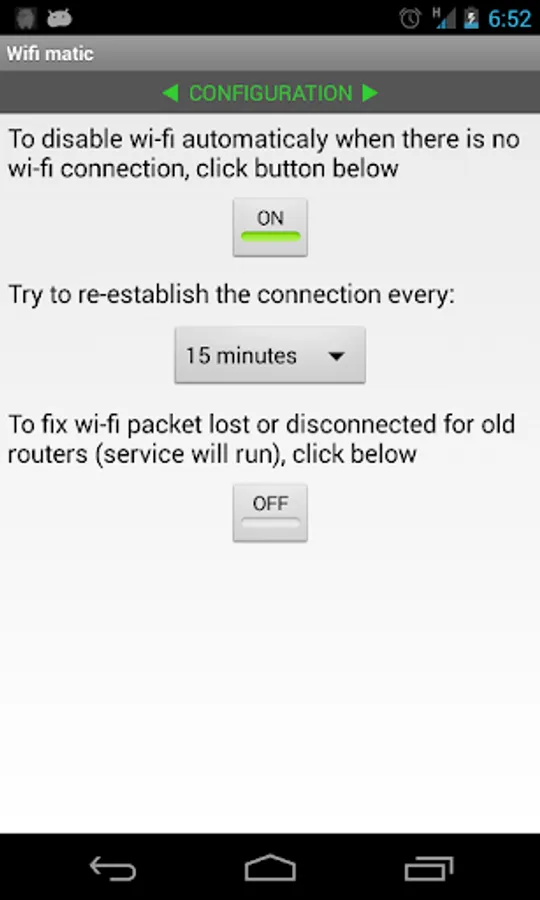 This application will save your battery by disabling wifi when there is no access point in range. You can set how often wifi matic will try to re-establish connection. This will fix unstable wi-fi connection.