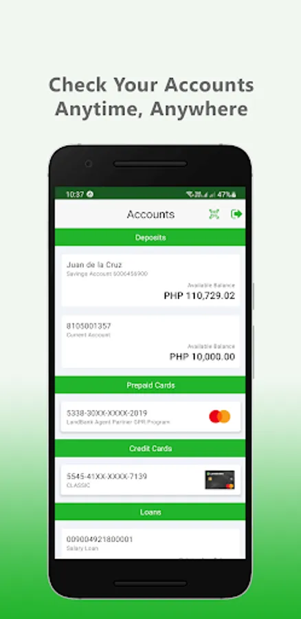 • View balances, monitor transactions, and check statements of your accounts, prepaid cards, cash cards, credit cards, salary loans, and investments