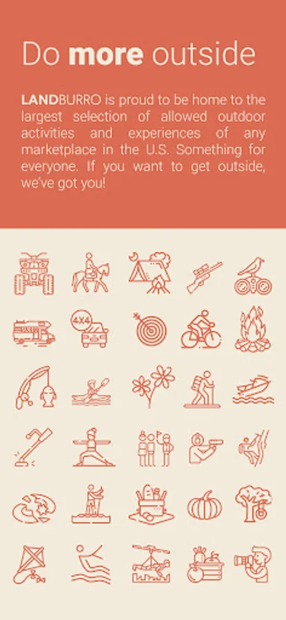 We enable guests to experience an abundance of outdoor activities on private land such as hunting, fishing, hiking, camping, picnicking, biking, kayaking, etc. while creating meaningful revenue opportunities for landowners. LandBurro is proud to be the home to the largest selection of allowed outdoor activities and experiences of any online marketplace in the U.S.