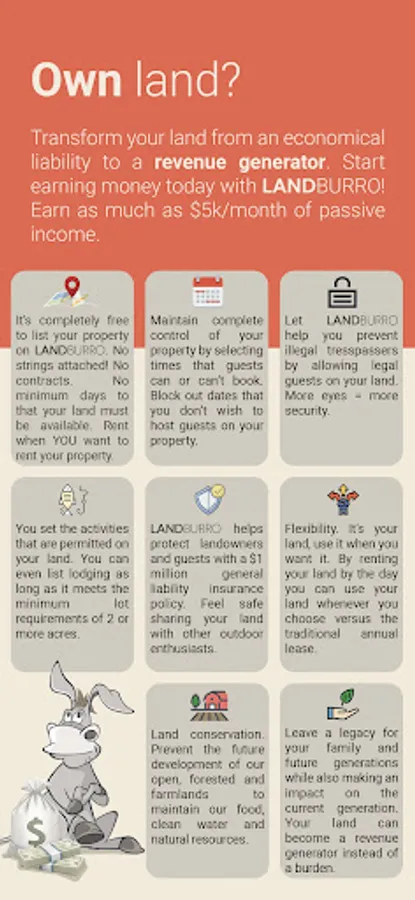 · List your property on LANDBURRO and begin earning money today! Offer land, lodging or an experience as long as it is on at least 2 acres of land.
