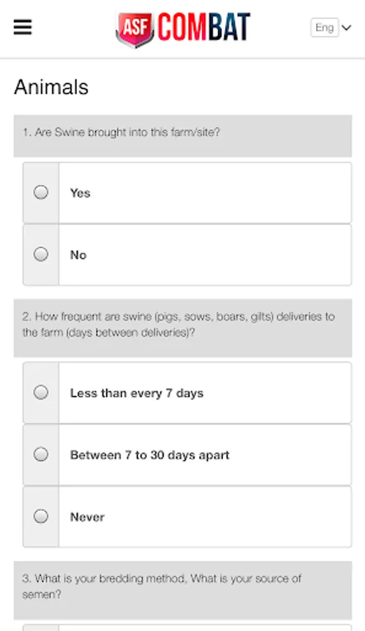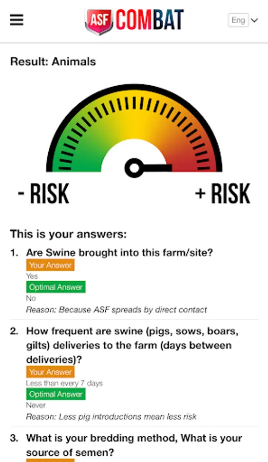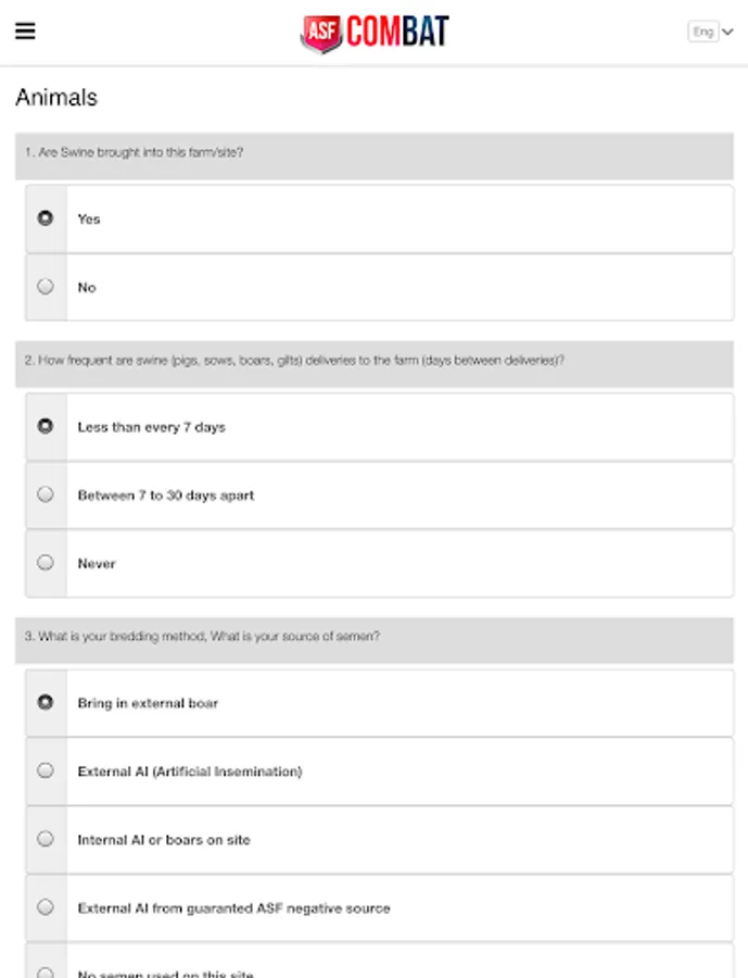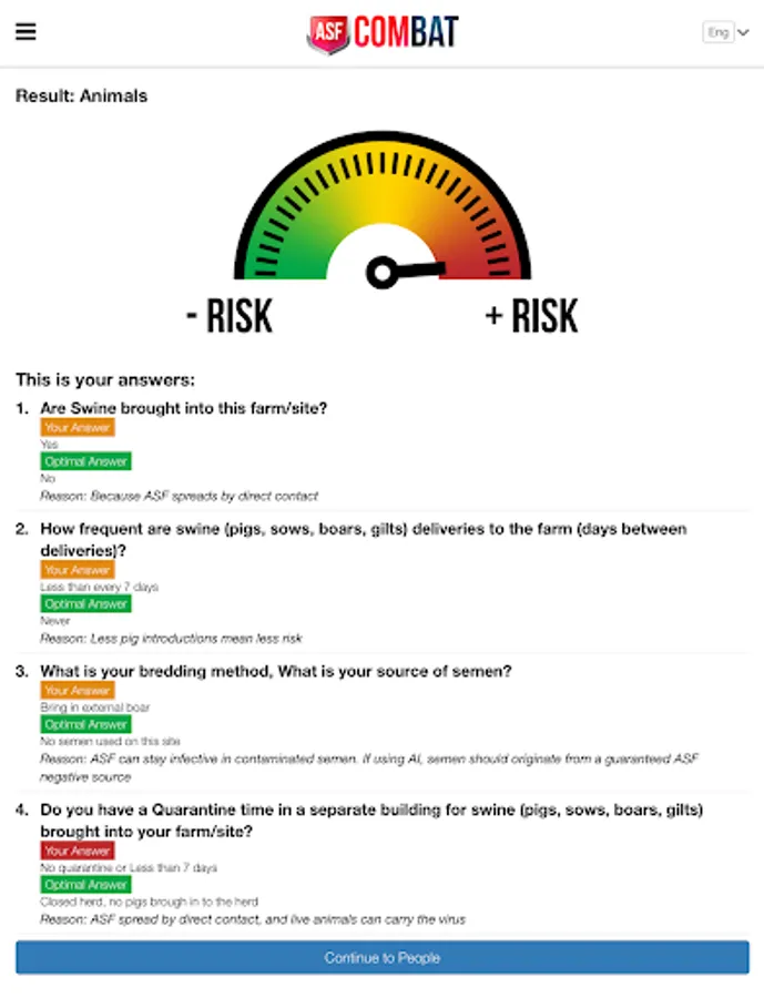 A set of questions based on the known biosecurity risks for ASF provides an indicative risk score and gives you optimal solutions to build and maintain the highest possible biosecurity around your farm, so you have the best odds to prevent African Swine Fever.