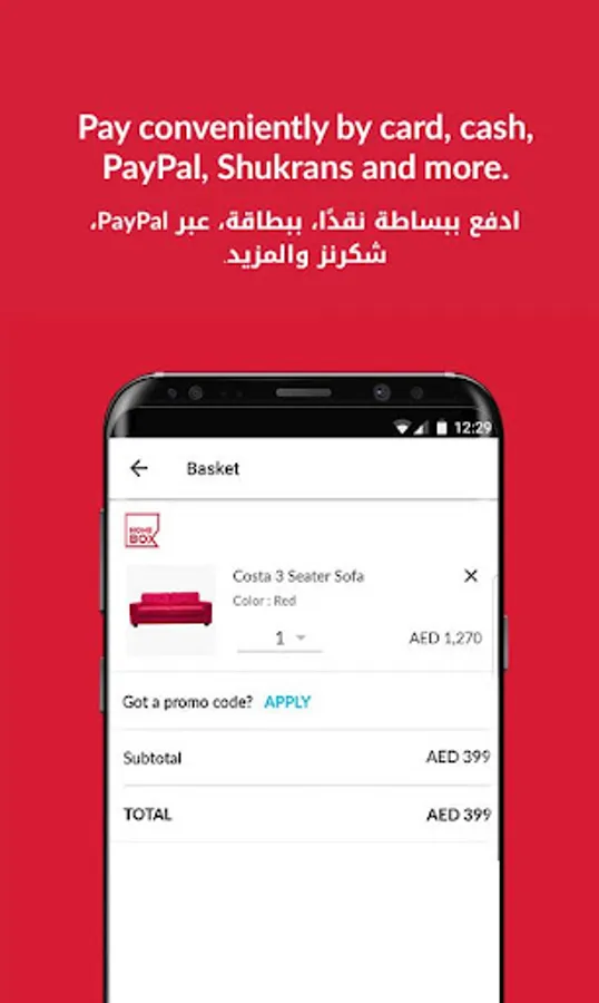 استمتع بالشحن المجاني على الطلبات بأكثر من 250 درهم في الإمارات أو 250 ريال في السعودية أو 25 دينار في البحرين، وعلى طلبات الأثاث بأكثر من 1,500 درهم في الإمارات أو 2,000 ريال في السعودية أو 150 دينار في البحرين. واستفد من ضمان هوم بوكس للجودة "أكثر من وعد" الذي يوفر ضمان محدود لمدة عامين، ضمان لأفضل سعر، وأكثر بكثير.