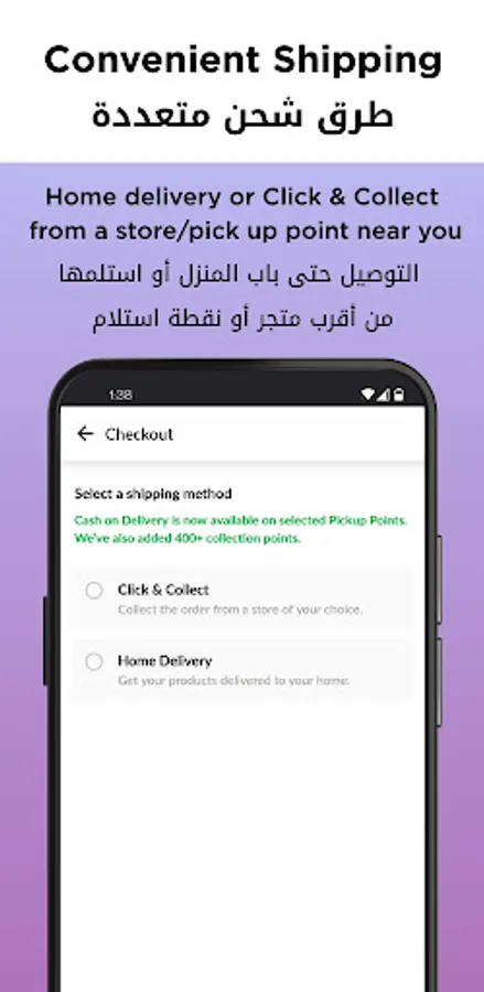 اختر إما التوصيل حتى باب المنزل، أو استلم مشترياتك من المتجر أو من أي نقطة استلام قريبة لك.