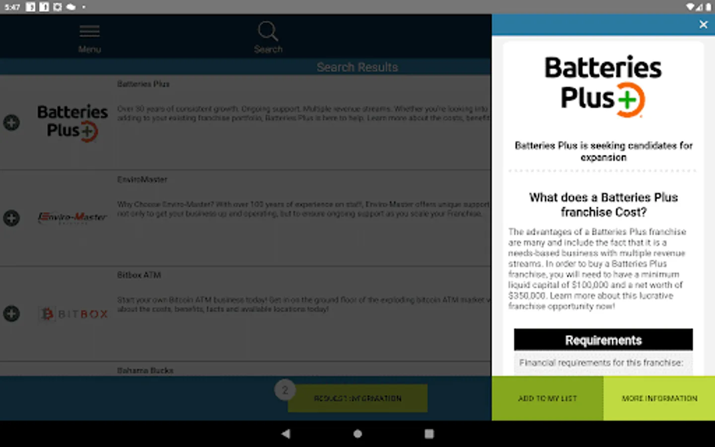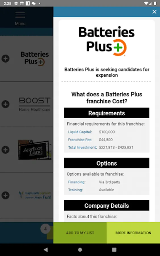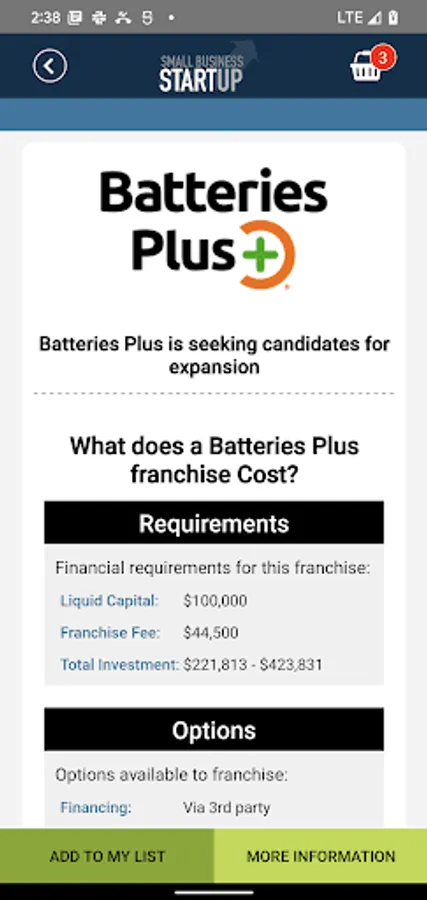 Small Business Startup also tells you how long the opportunity has been in business, and how fast it is growing. The app lists the total business cost and investment required, and in many cases, we break out the fee and standard business royalties. Best of all, we provide a safe, easy and secure way to contact the business team directly to learn more about the best businesses for sale.