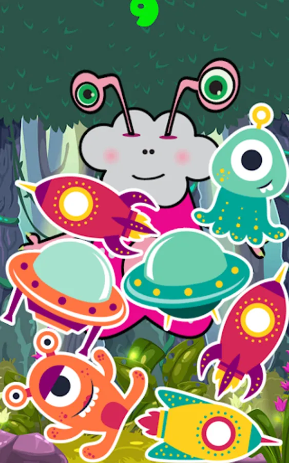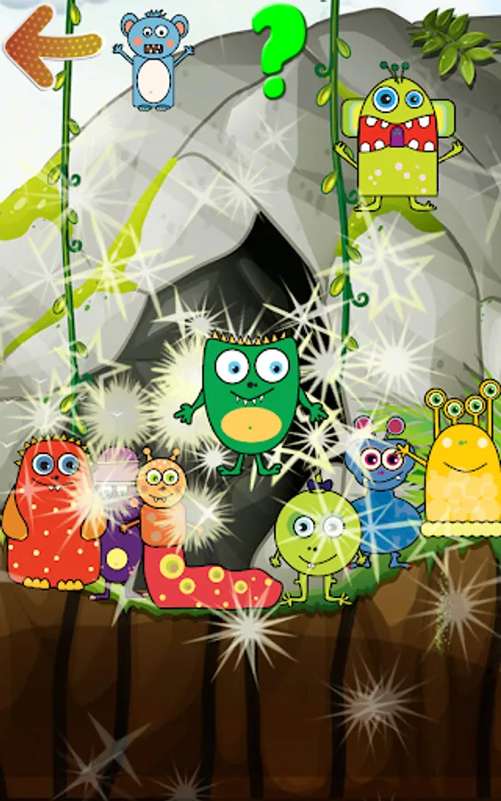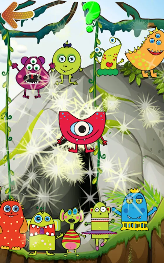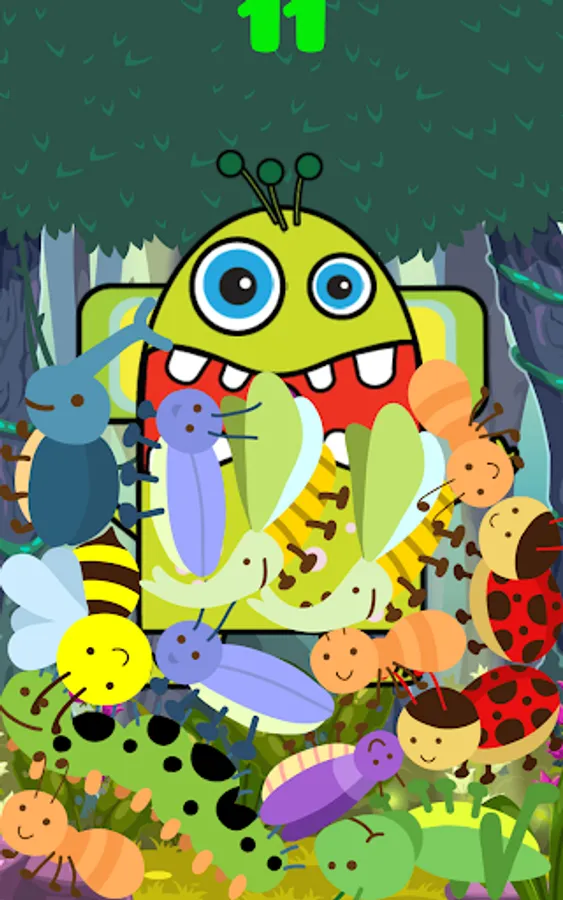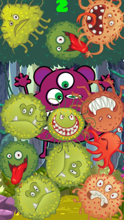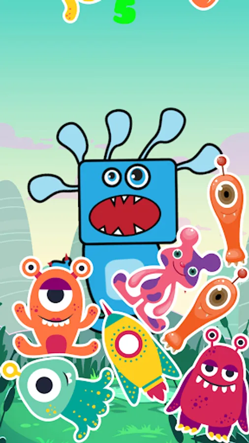 First, your child selects a friendly monster, and then your child pops the falling objects as fast as possible! The objects start off large and slow, but as your child completes more monsters, the objects get smaller and faster. Completed monster are put in a jungle where they can be played with.