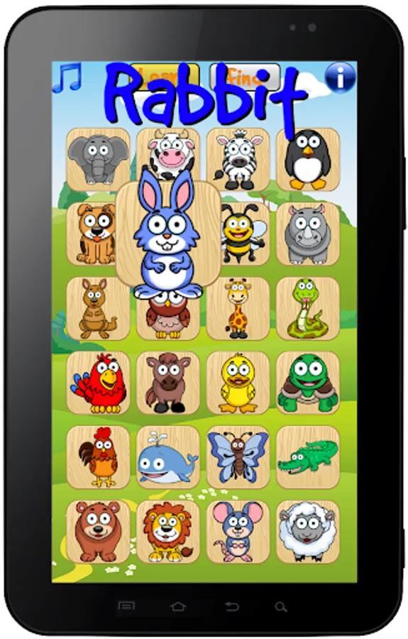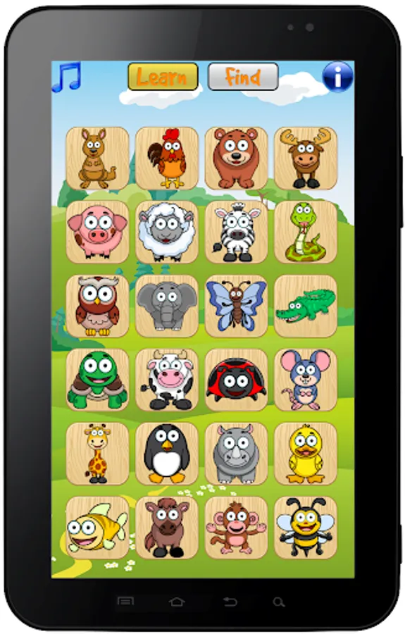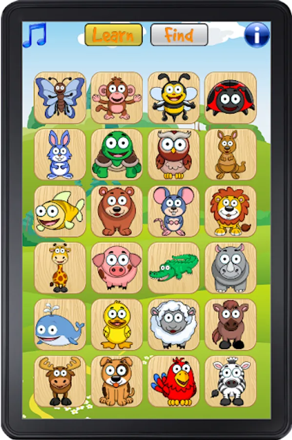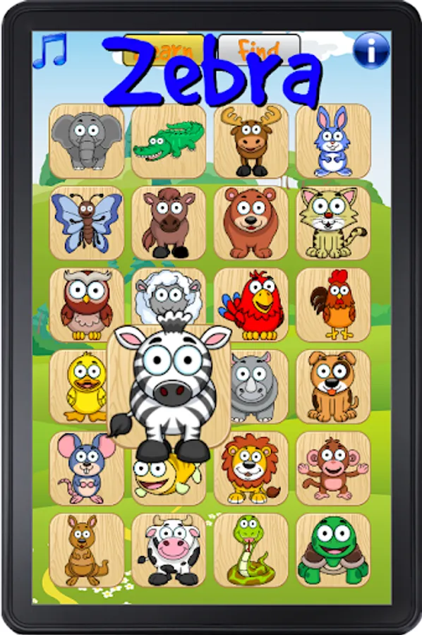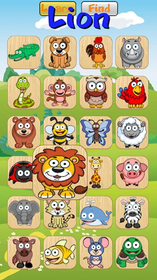 Learn: In this game mode, your child can tap on any animal tile to hear its name and animal sound. Find: In this game mode, your child is asked to find an animal by name and is given positive feedback when they succeed.