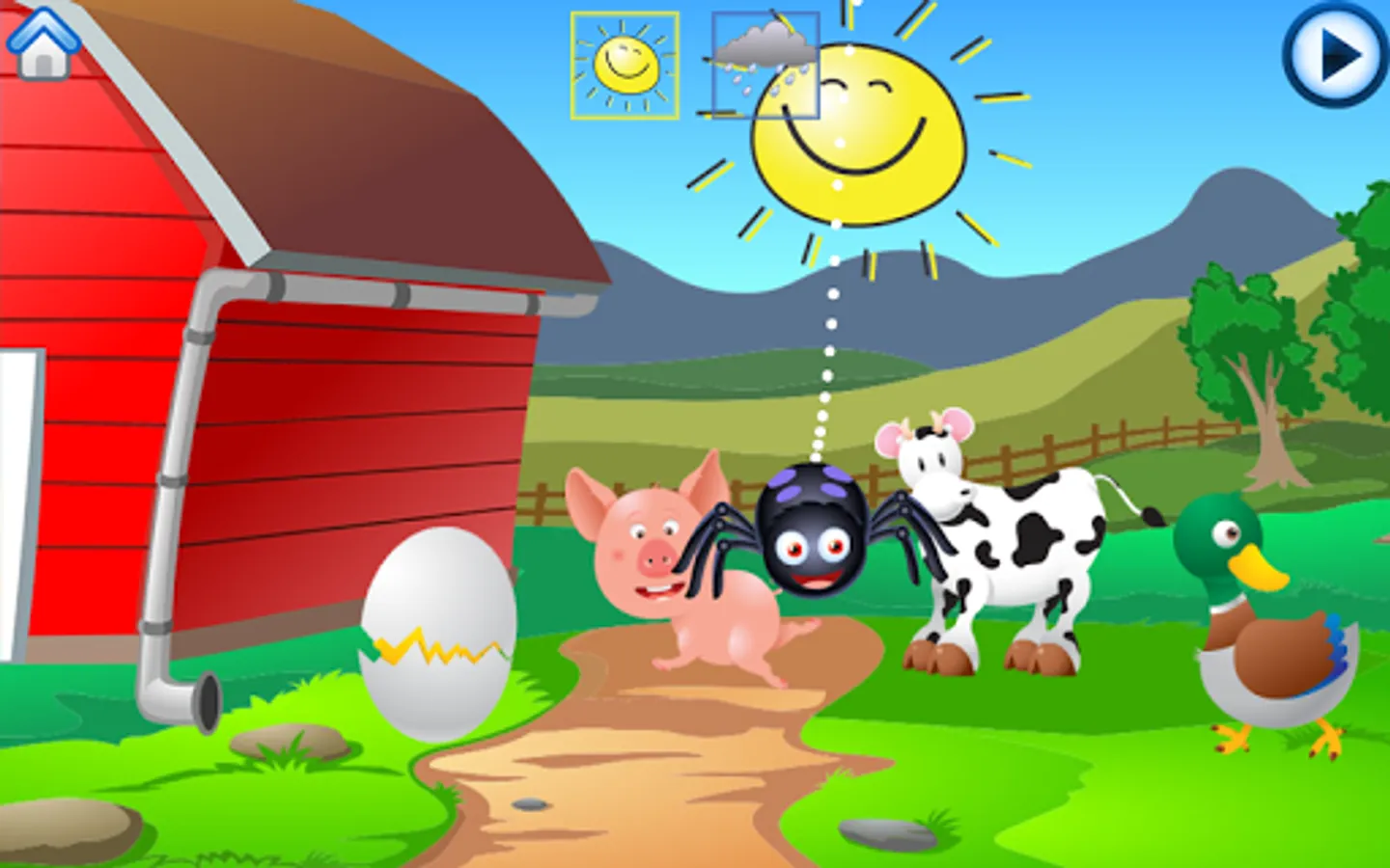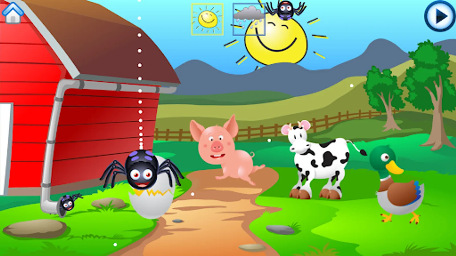 Spiders crawling everywhere! Make it rain, make it shine, get the spiders to go up the spout. Lots of silly spider actions and noises, and a few farm animals waiting to be played with.