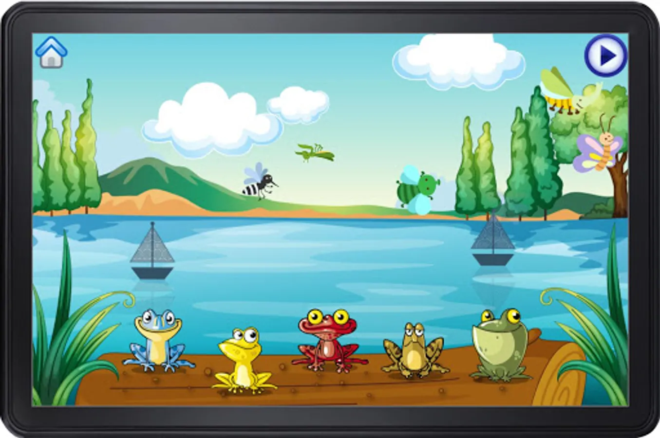 A counting song that features five unique frogs that love to eat bugs - and there are a lot of bugs! As the song progresses, the frogs jump in the water until there are none left. Tap on the bugs to eat them, move the frogs around, touch the sailboats, and more!
