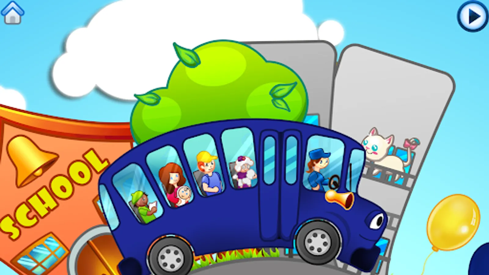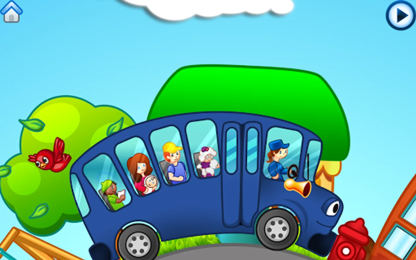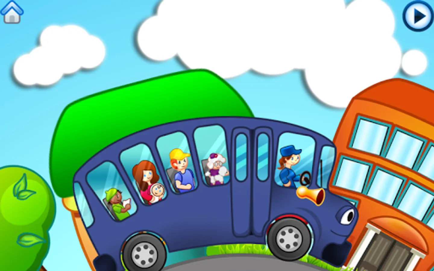 Sing with the happy bus and its passengers as it travels around the town. This bus has it all: wipers, horn, mom, baby, and more. To start a verse, tap the corresponding object (12 verses total). Hint: to change the bus color, try popping the balloons.