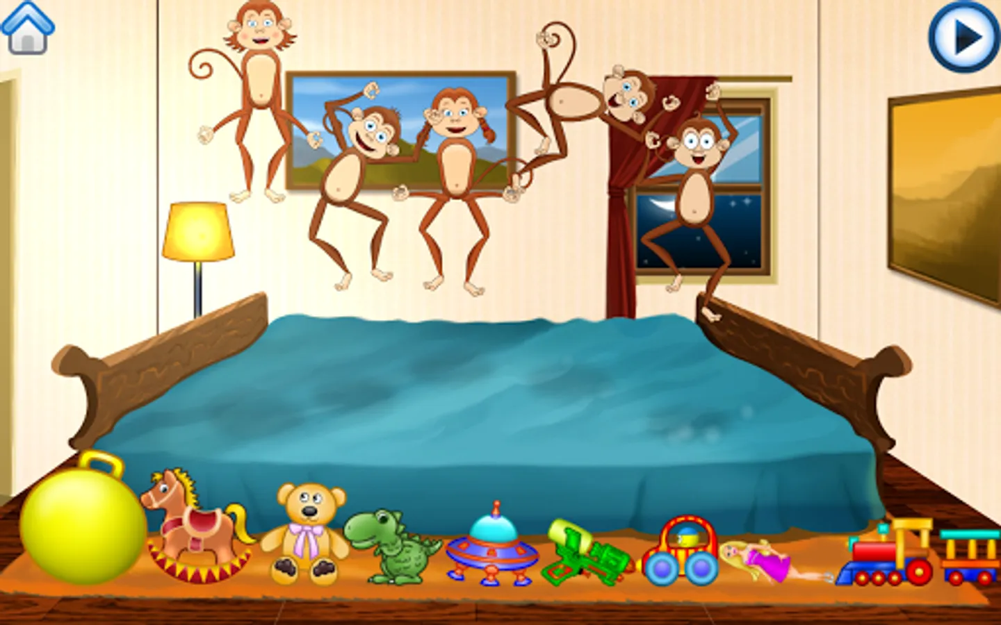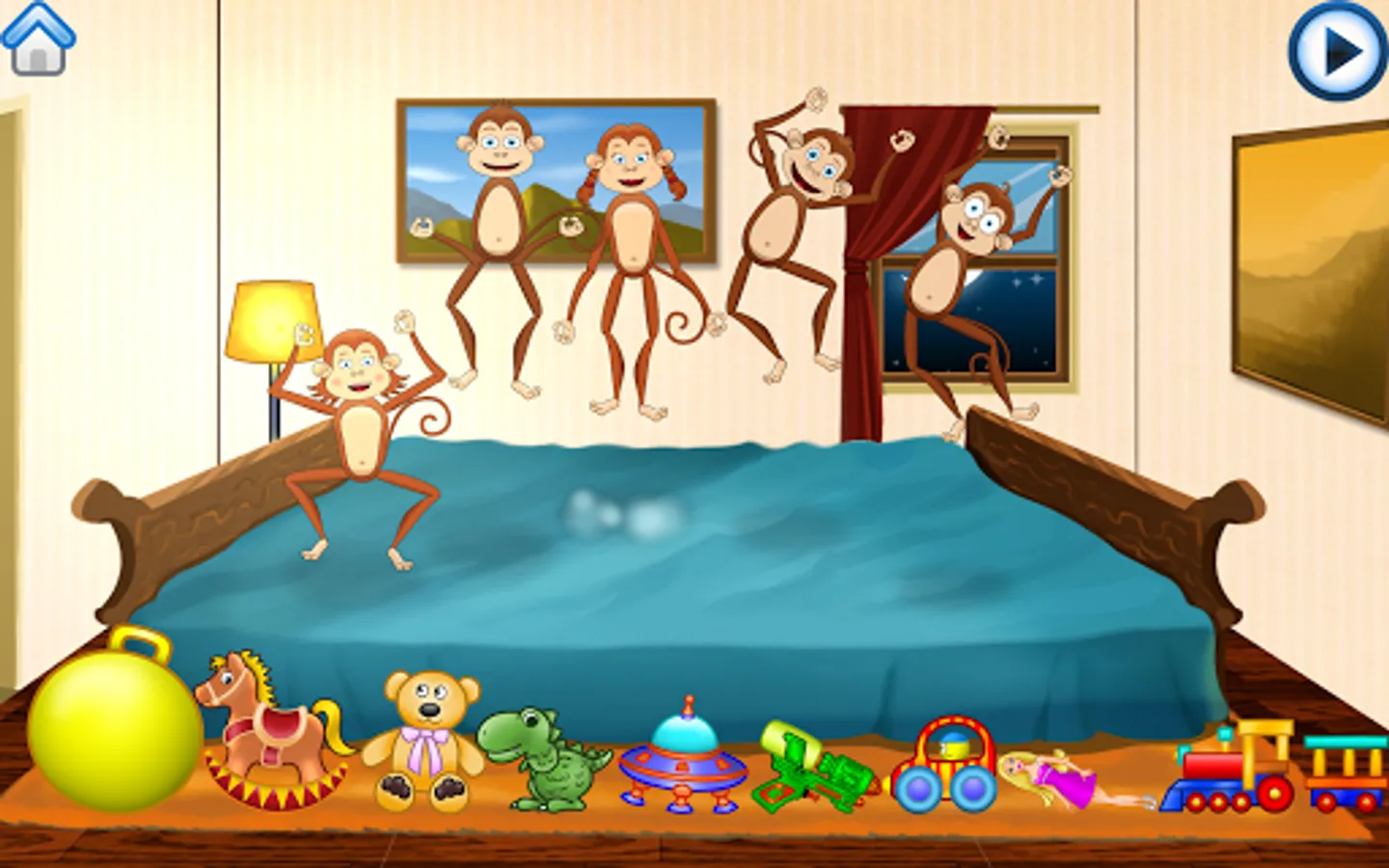 This counting song features five unique monkeys that love to jump. When the lights turn on, sing along as the monkeys do their tricks. Each time a monkey bumps his head, mom calls the doctor until there are no monkeys left. Time to go back to bed!