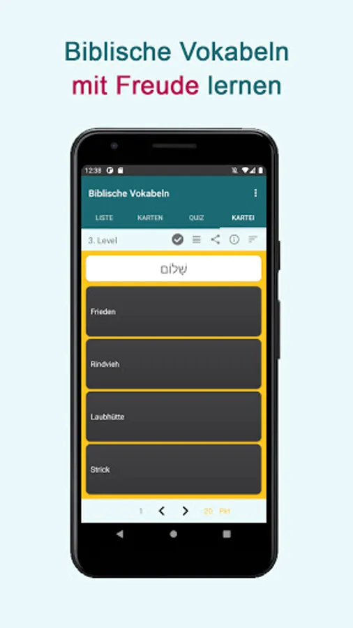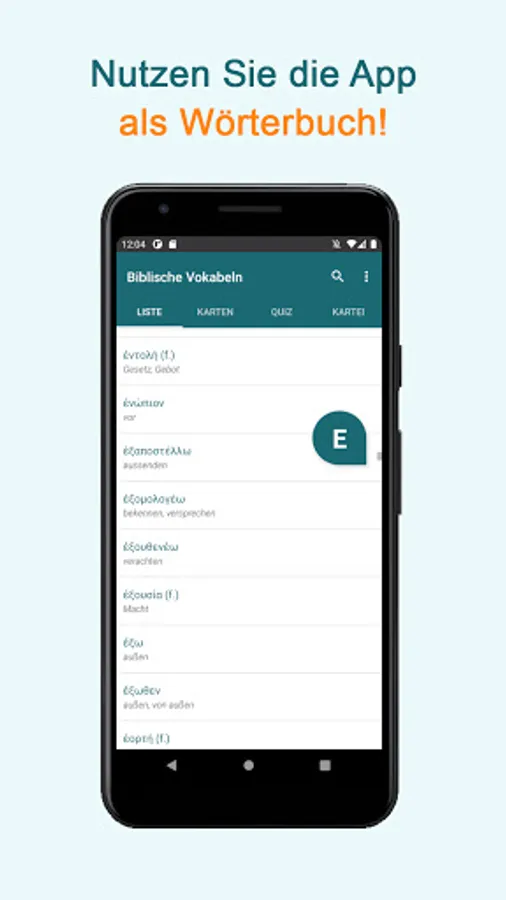 Biblical Vocabulary offers you the most important words of the Bible in Greek and Hebrew with their German translation. You can also use the app like a pocket dictionary via the alphabetical list. A search function enables specific words to be looked up.