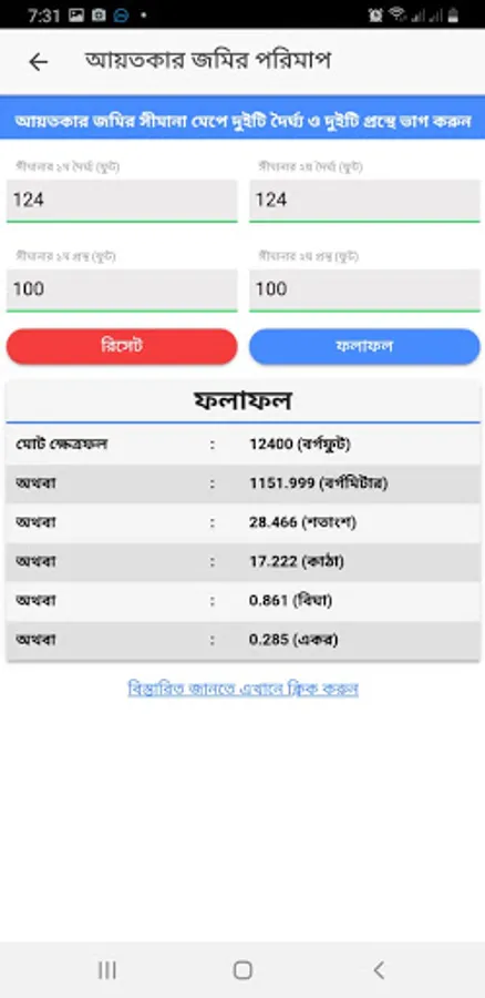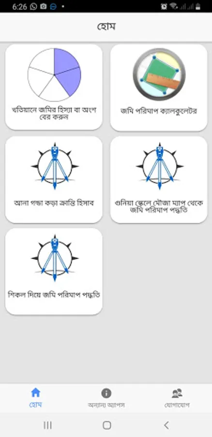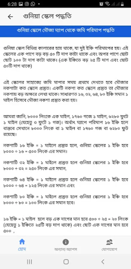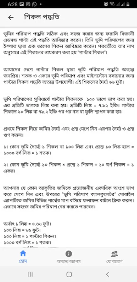 Using this app, the amount of land of any one or more persons can be calculated from the old ledger- e.g., CS, SA etc. Any land can be measured. Besides, in the old ledger, the existing ana-ganda-kara-kranti calculation, land measurement method, different units of land measurement and different formulas for land measurement, land measurement method from mouza map on Gunia scale, land measurement method with chain etc. can be known.
