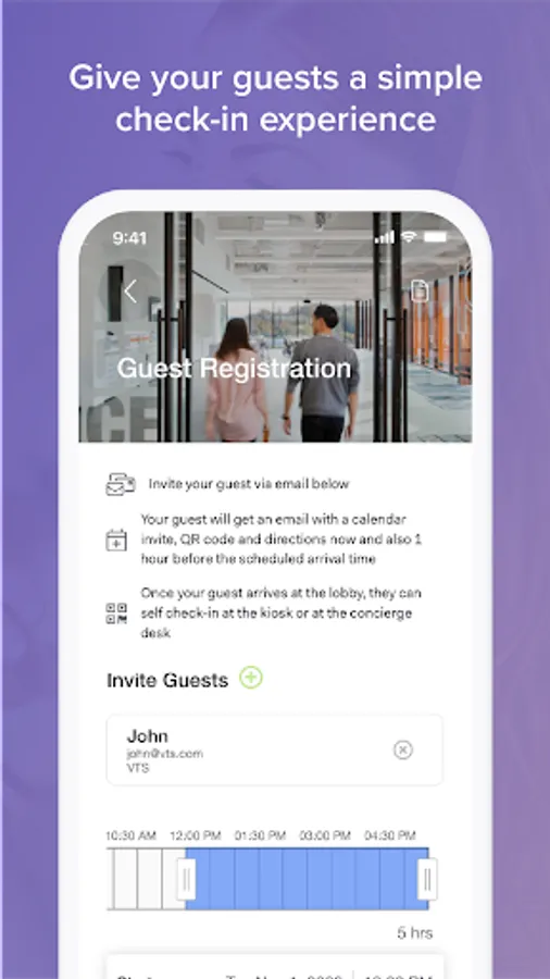 Give guests a simple check-in experience. Invite them, sign them in, and get notified when they arrive.