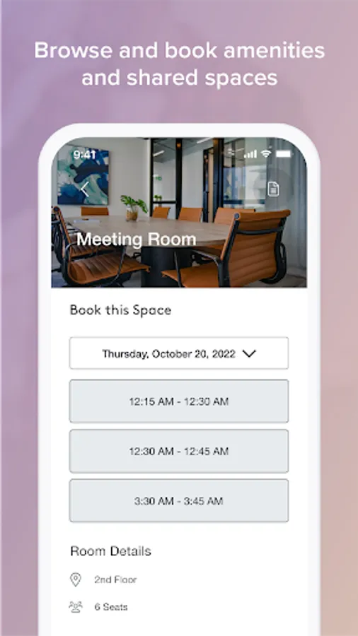 Browse and book amenities and shared spaces like meeting rooms, fitness studios, desks, and more.