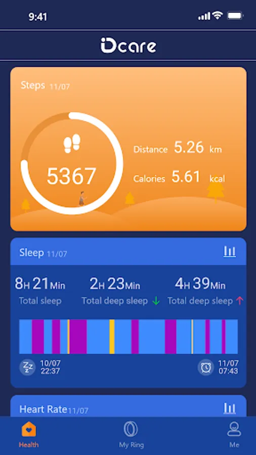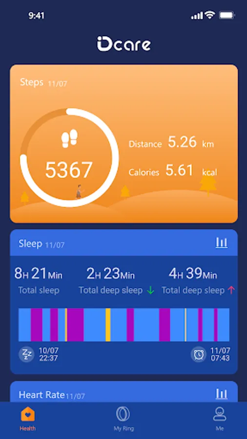 Dcare Ring is the software that works with the smart ring. The data content obtained by the smart ring tracking will be displayed in the software in a timely manner. The software will detect and evaluate the user's exercise data and various health data based on the obtained content, and draw various intuitive charts to help users better and easily understand and adjust their daily life status.