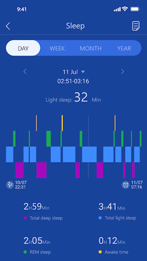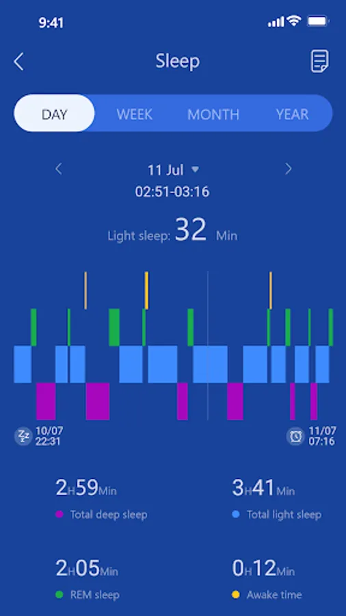 Records the user's sleep status, clearly shows the user's daily sleep and wake-up time, total sleep time, deep sleep time, light sleep time, REM time , and intuitively counts the percentage of deep sleep and light sleep to the total sleep time, to comprehensively and fully evaluate the user's sleep.