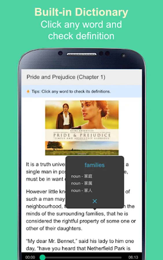 ● Meet a word you don't know? Click any word on the screen to use the built-in dictionary and check its translation.
