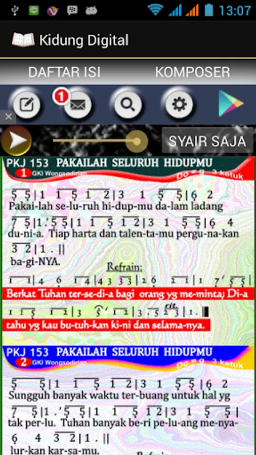 Kidung Jemaat (KJ), Nyanyikanlah Kidung Baru (NKB) Pelengkap Kidung Jemaat (PKJ) Music sheet. Indonesian notation form