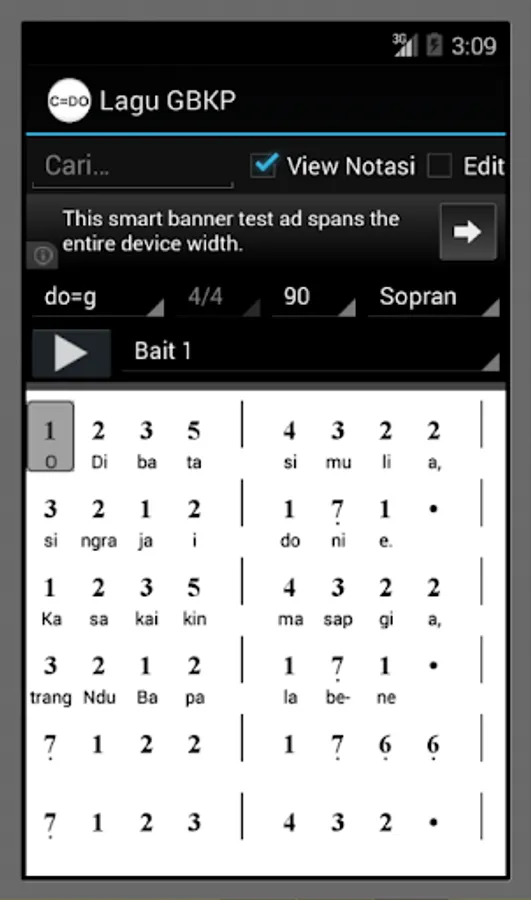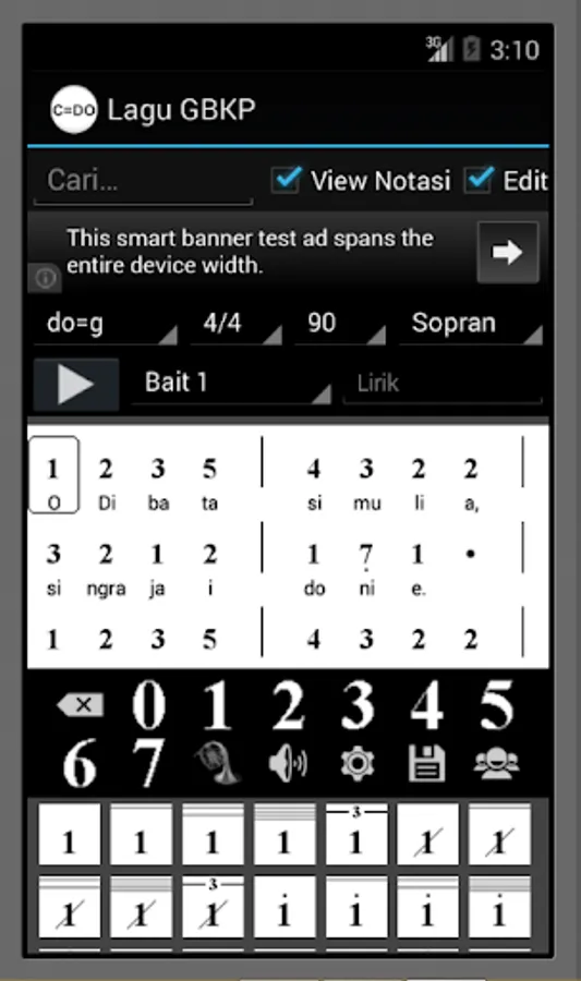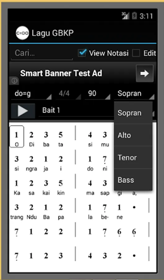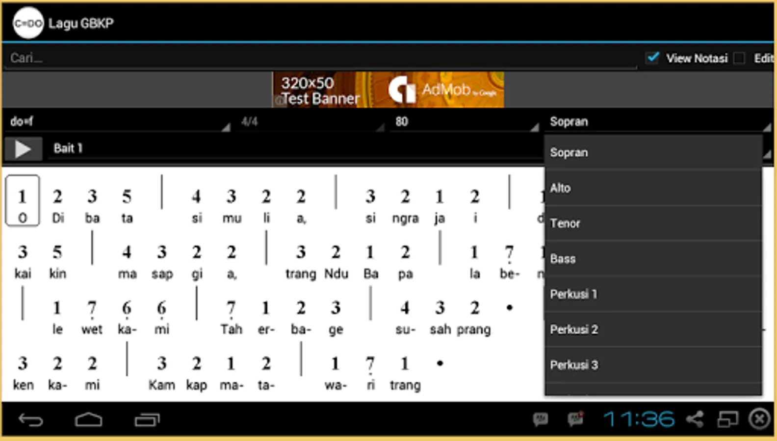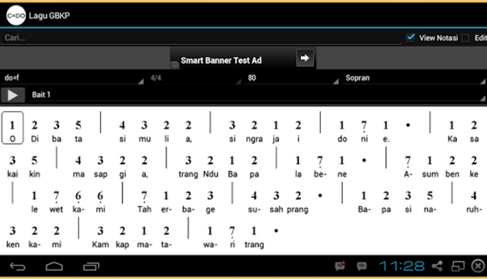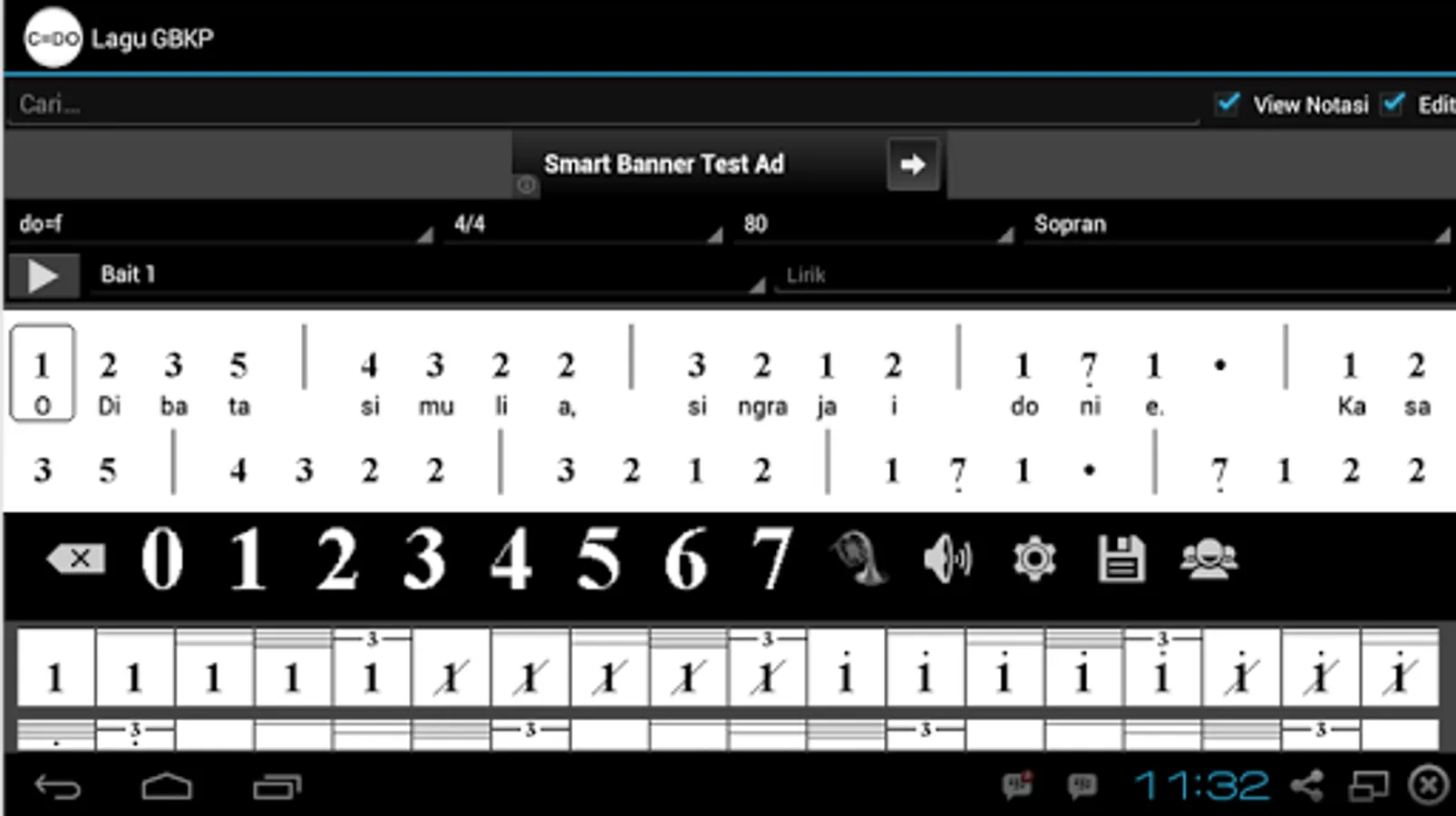 Aside from the conventional mode ode, the Lagu GBKP applications, there are features of the score mode, wherein the selected song may appear in sheet music form complete with lyrics and song notation. Format notation used is designed in the form of "Not Angka" so easy in reading and development. The notation is divided in the form Soprano Alto Tenor choir (SATB) to represent the sound of 1, 2, 3, and 4.